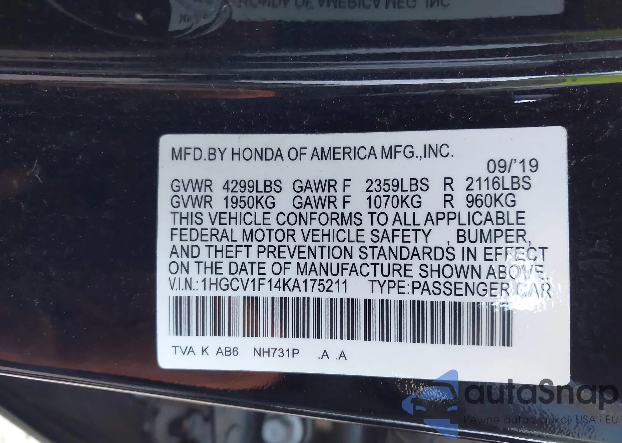• VIN 1HGCV1F14KA175211