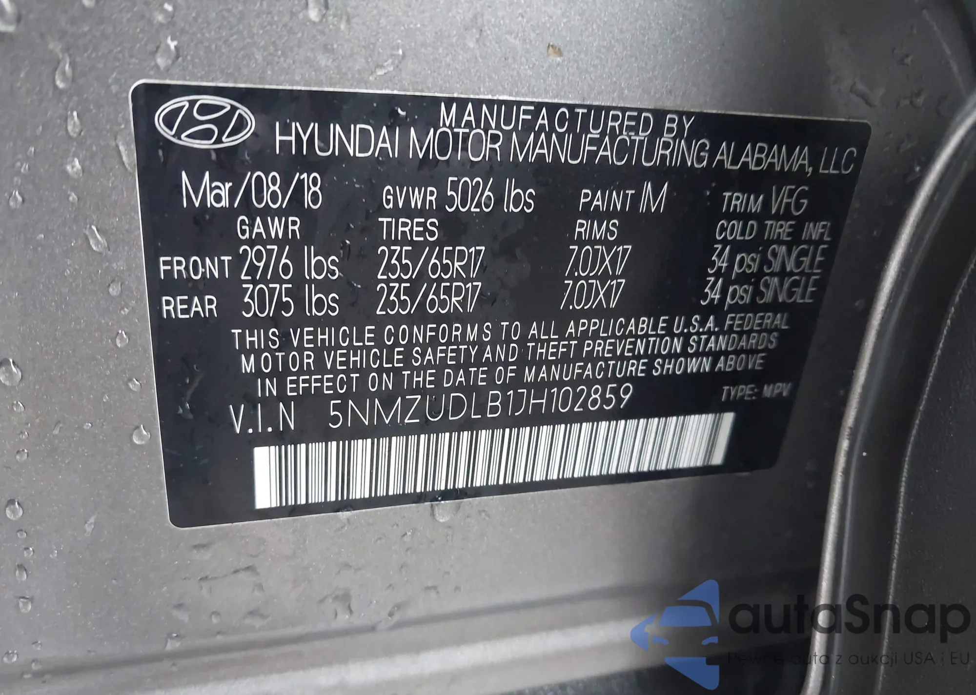 • VIN 5NMZUDLB1JH102859