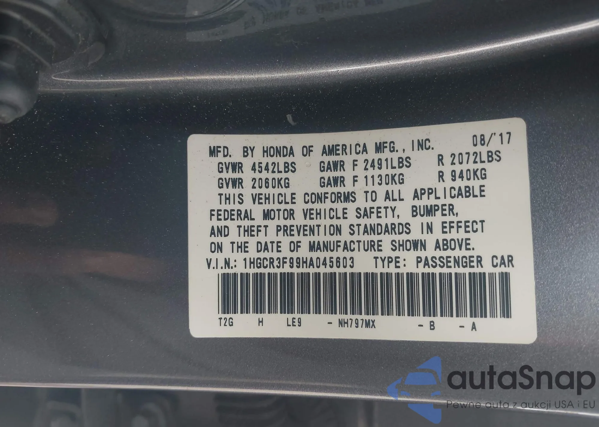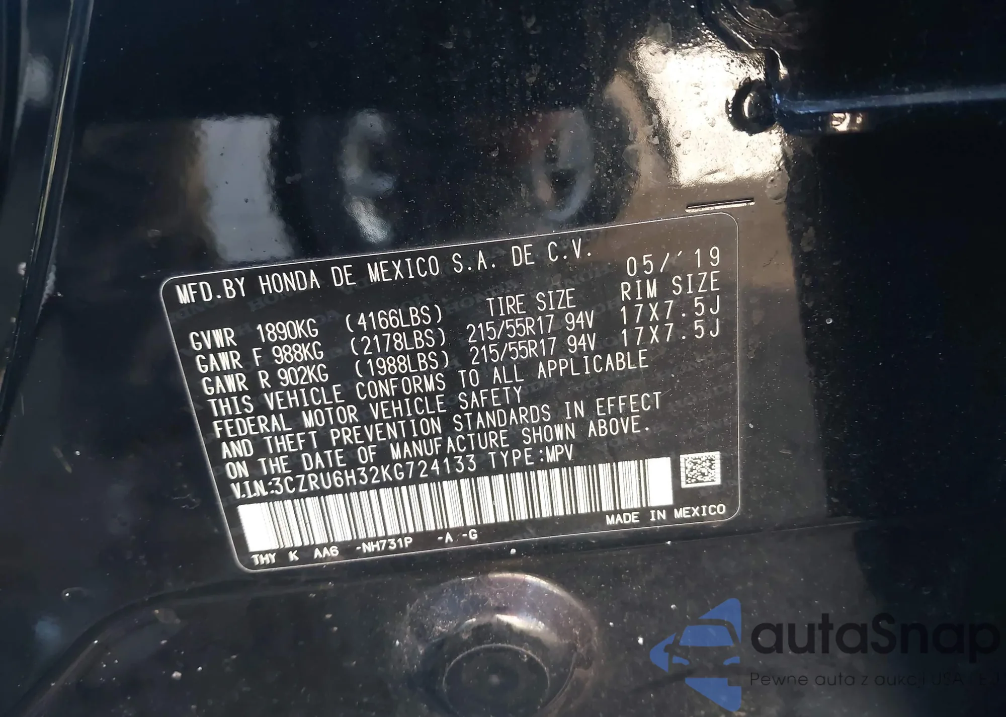 • VIN 5FNYF9H89TB032757