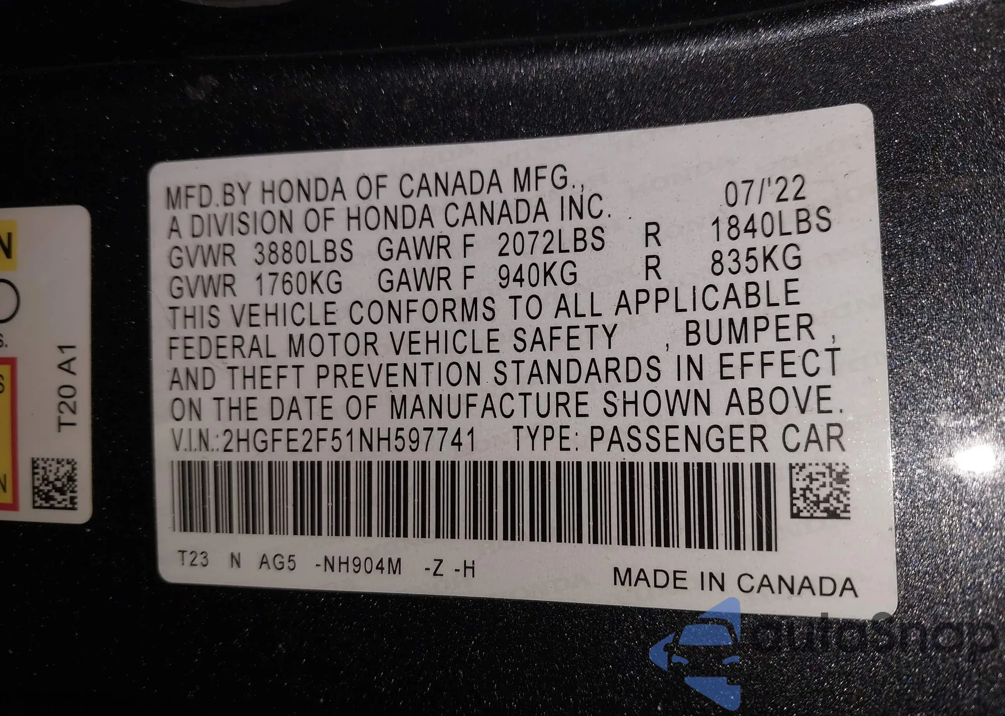 • VIN 2HGFE2F51NH597741