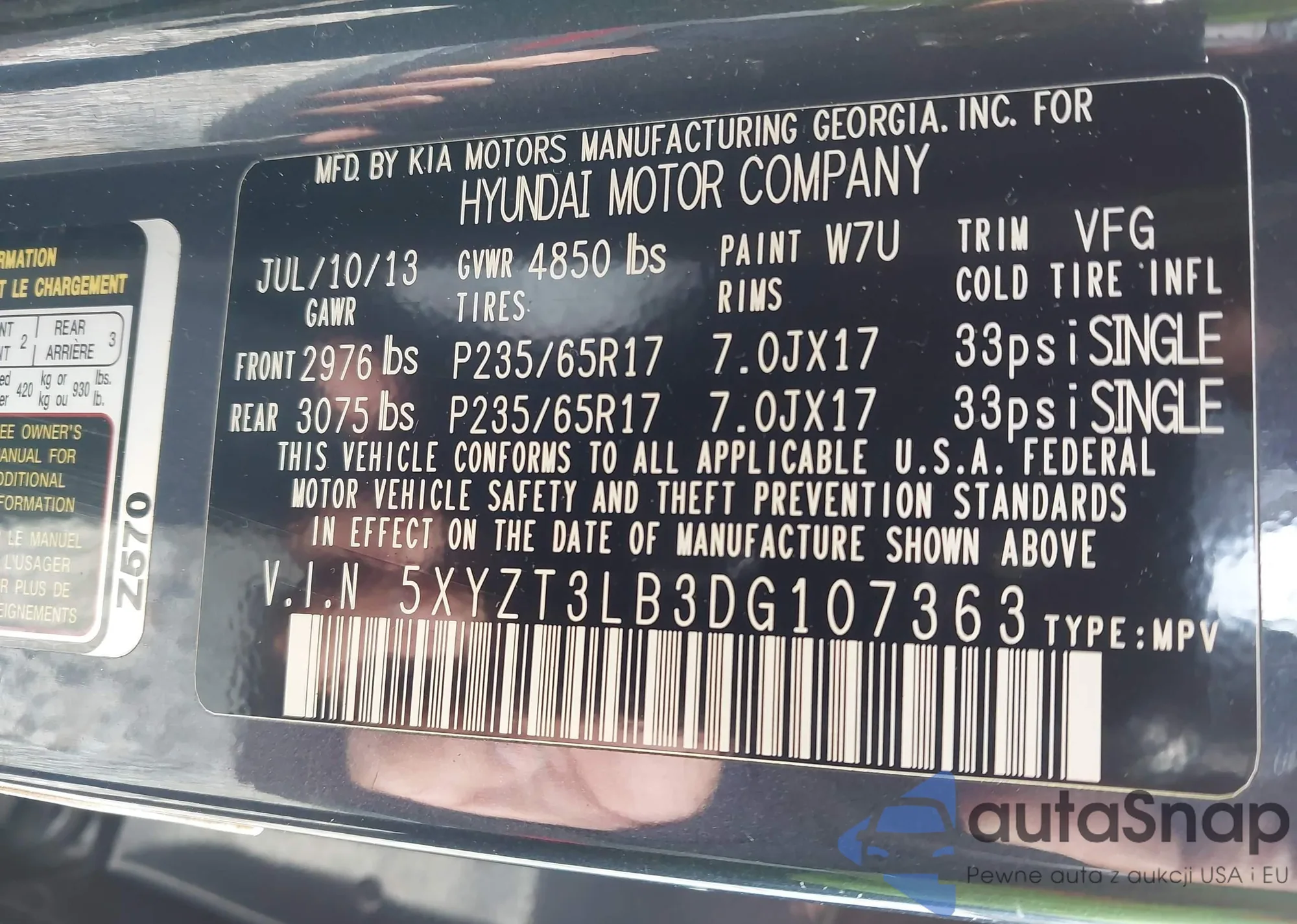 • VIN 5XYZT3LB3DG107363