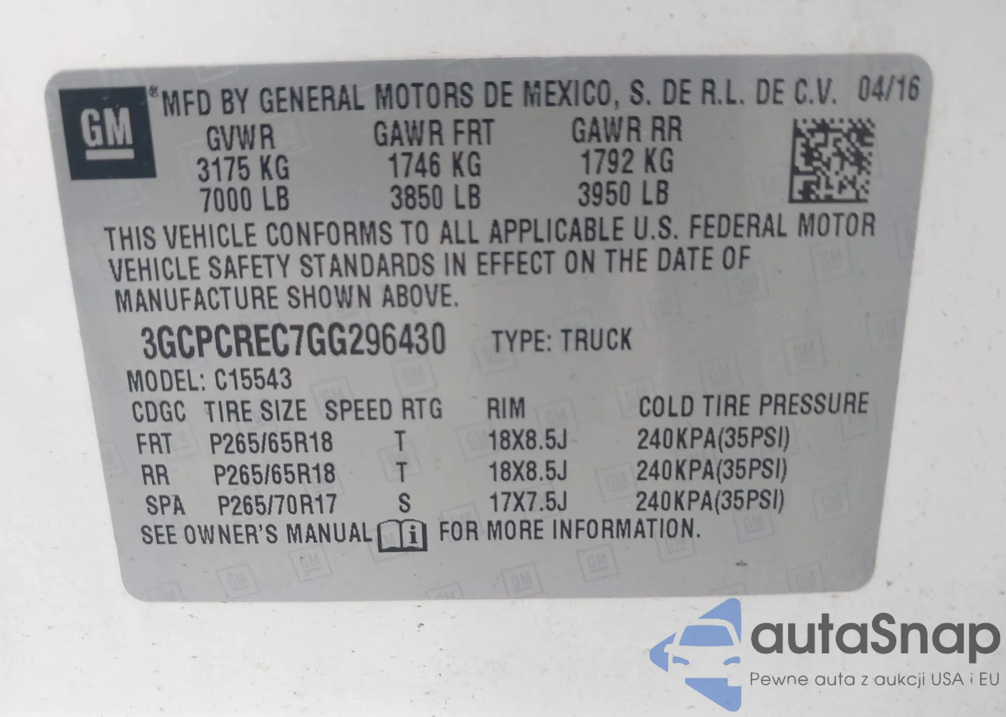 • VIN 3GCPCREC7GG296430