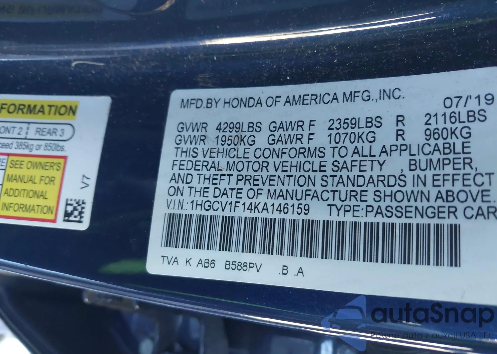 • VIN 1HGCV1F14KA146159