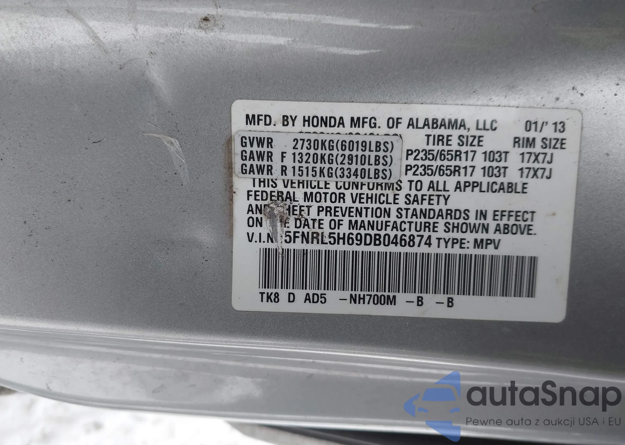 • VIN 5FNRL5H69DB046874