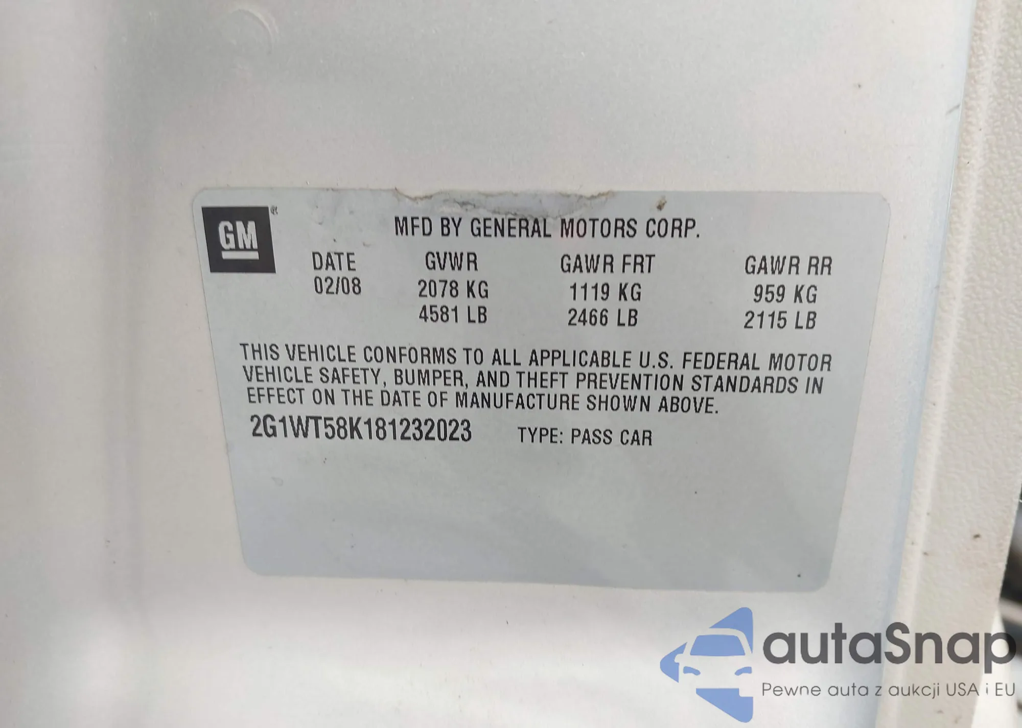 LOT: 44311685 VIN: 2G1WT58K181232023