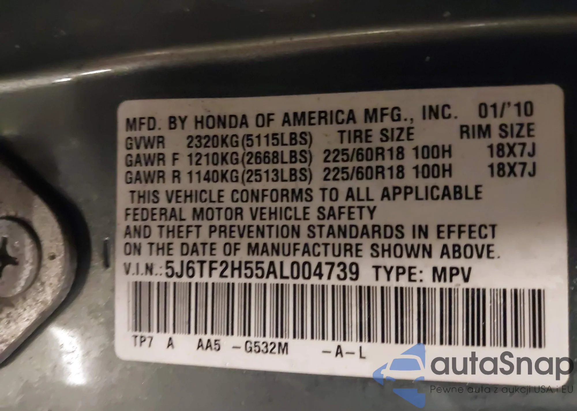 • VIN 5J6TF2H55AL004739
