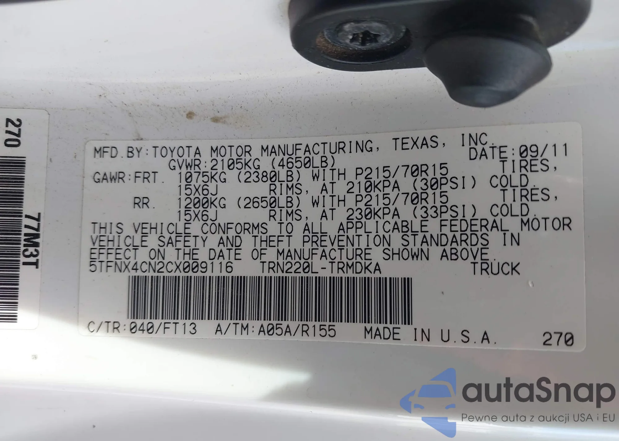 • VIN 5TFNX4CN2CX009116