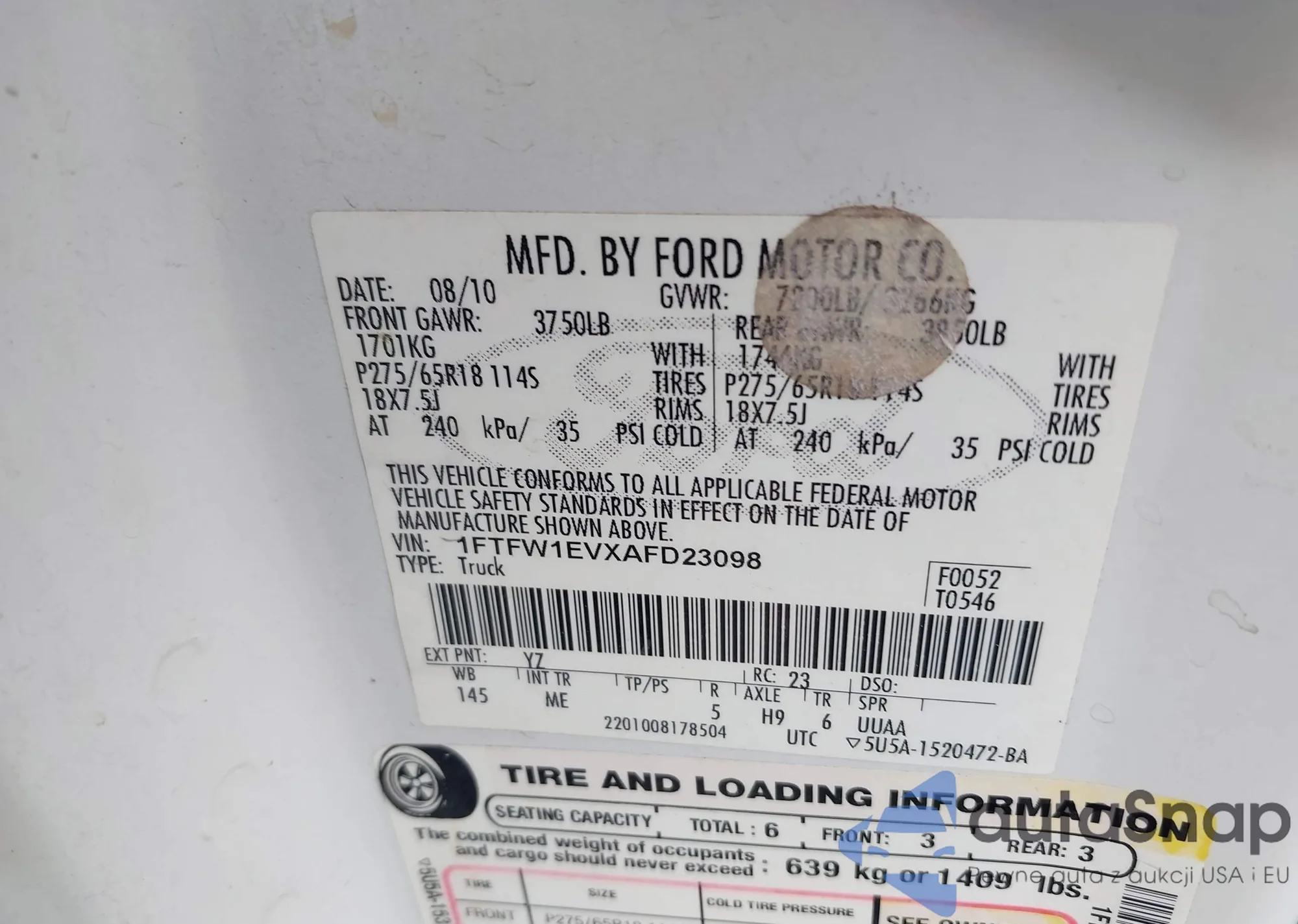 2010 Ford F150 from USA, damaged, VIN 1FTFW1EBXAFB23098