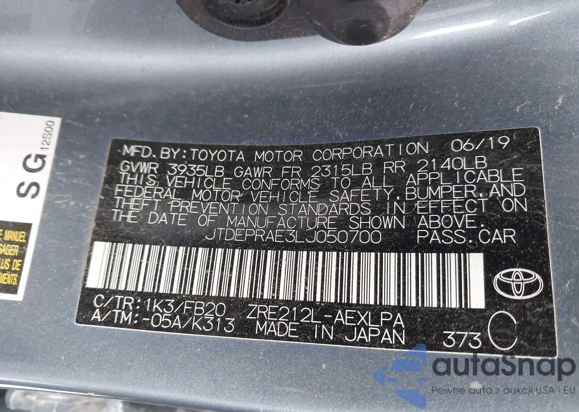 LOT: 43498392 VIN: JTDEPRAE3LJ050700