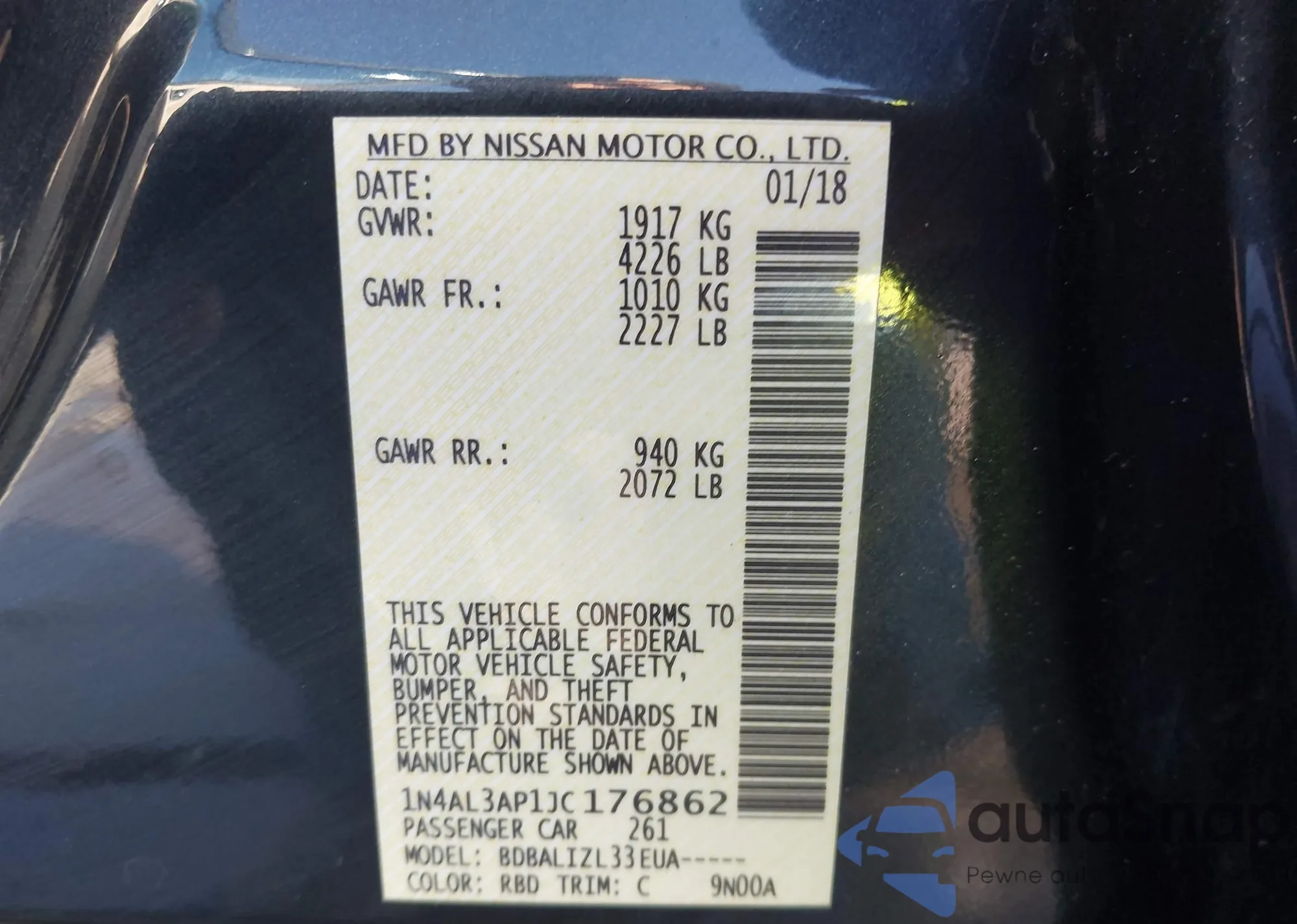 • VIN 1N4AL3AP1JC176862