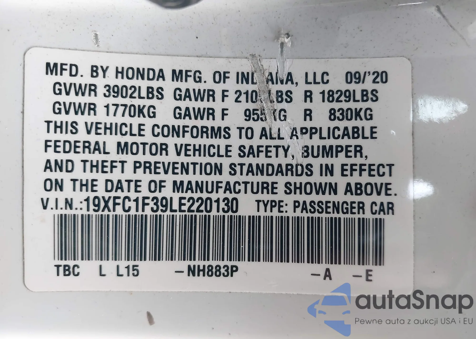• VIN 19XFC1F39LE220130