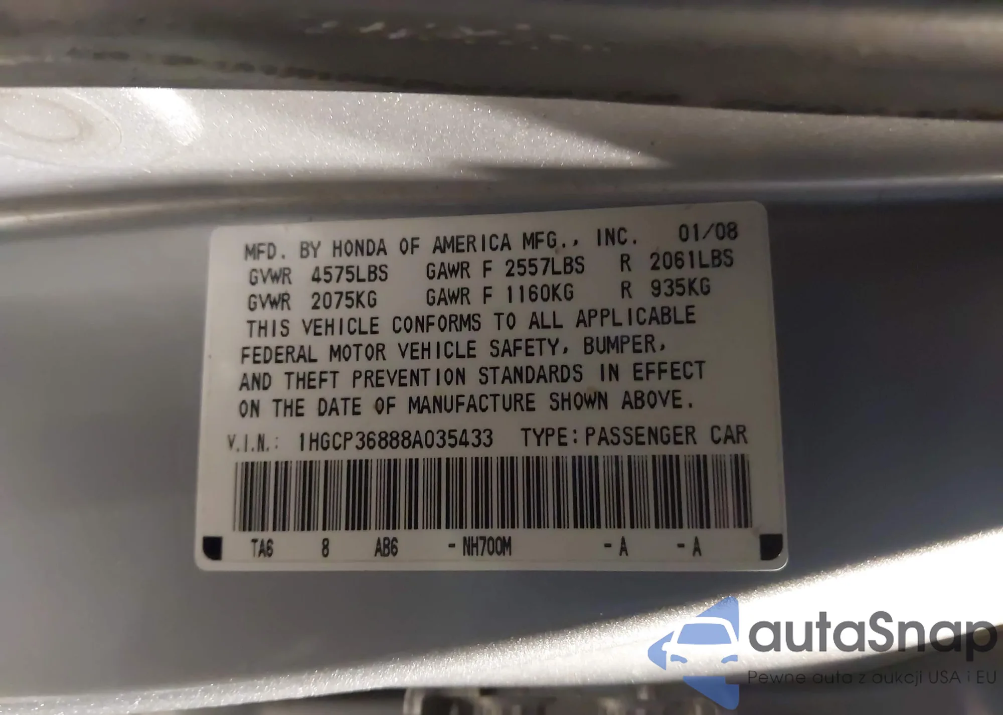 LOT: 44216936 VIN: 1HGCP36888A035433