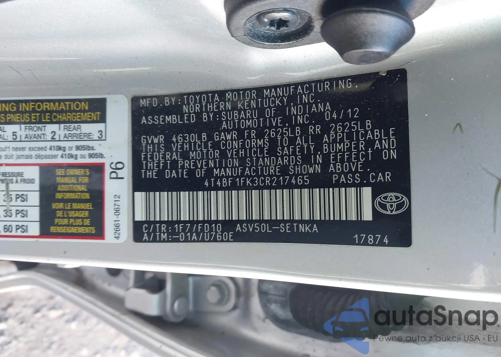 • VIN 4T4BF1FK3CR217465