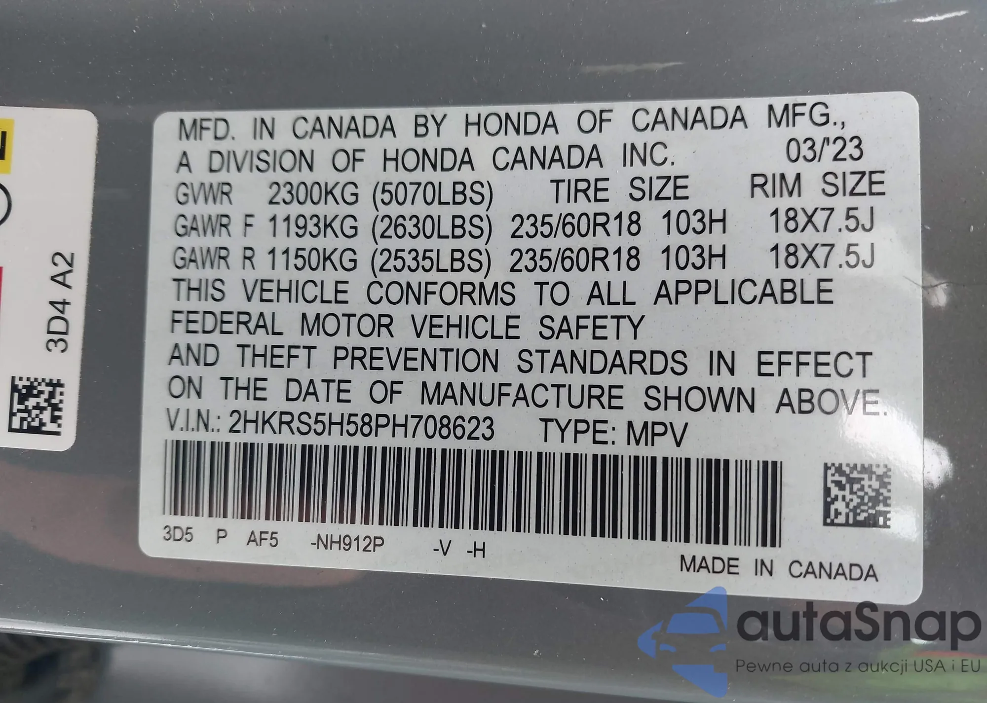 LOT: 44271803 VIN: 5FNYF18517D009180