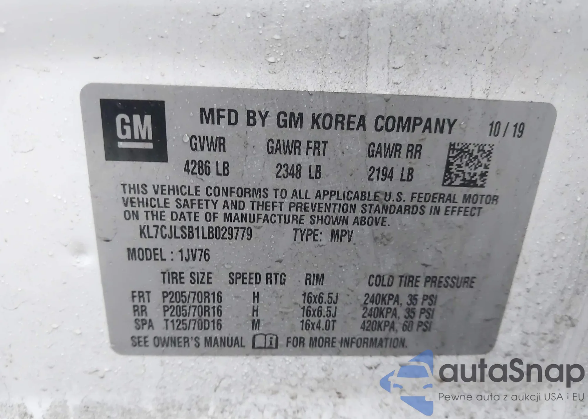 • VIN KL7CJLSB1LB029779