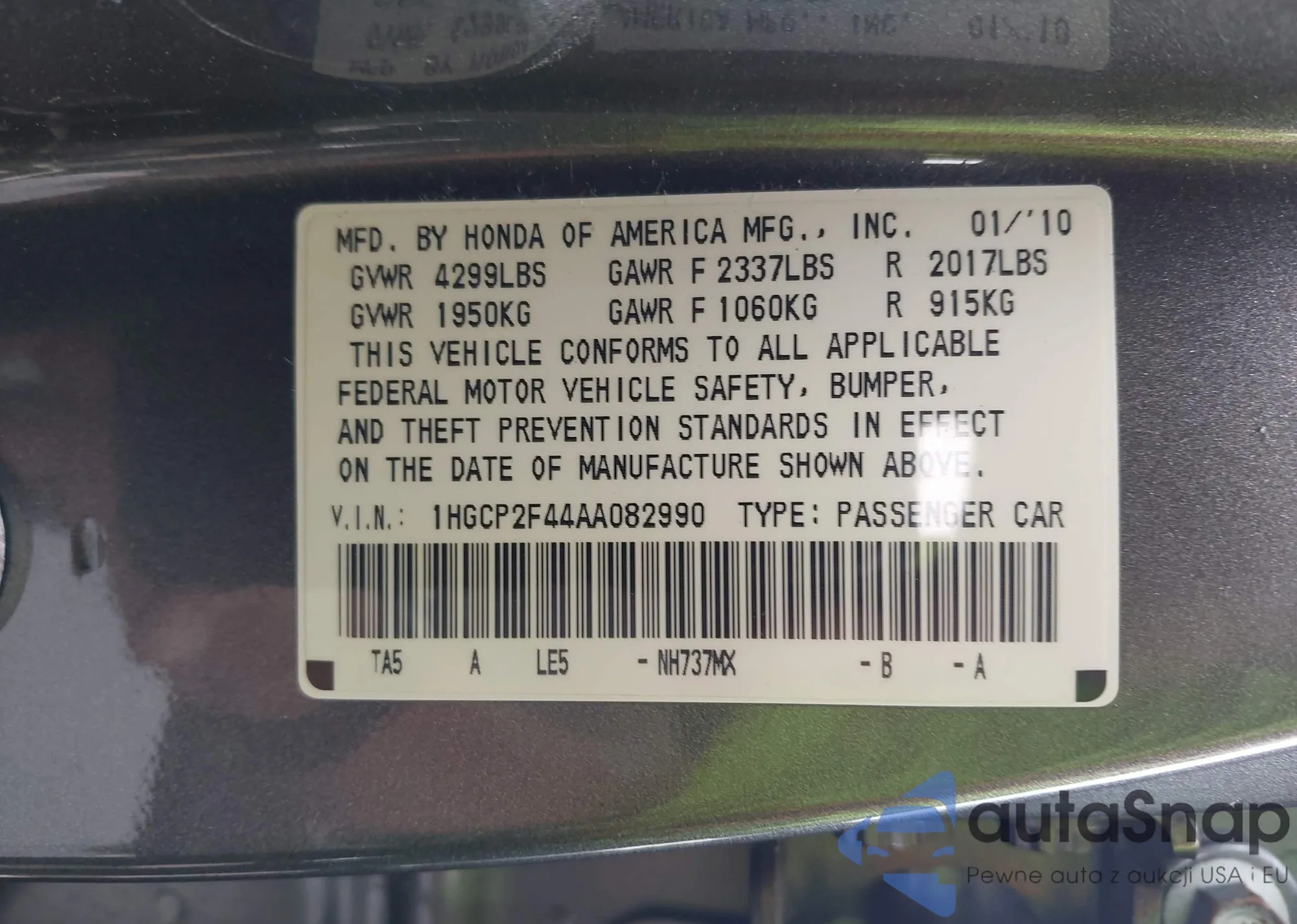 • VIN 1HGCP2F44AA082990