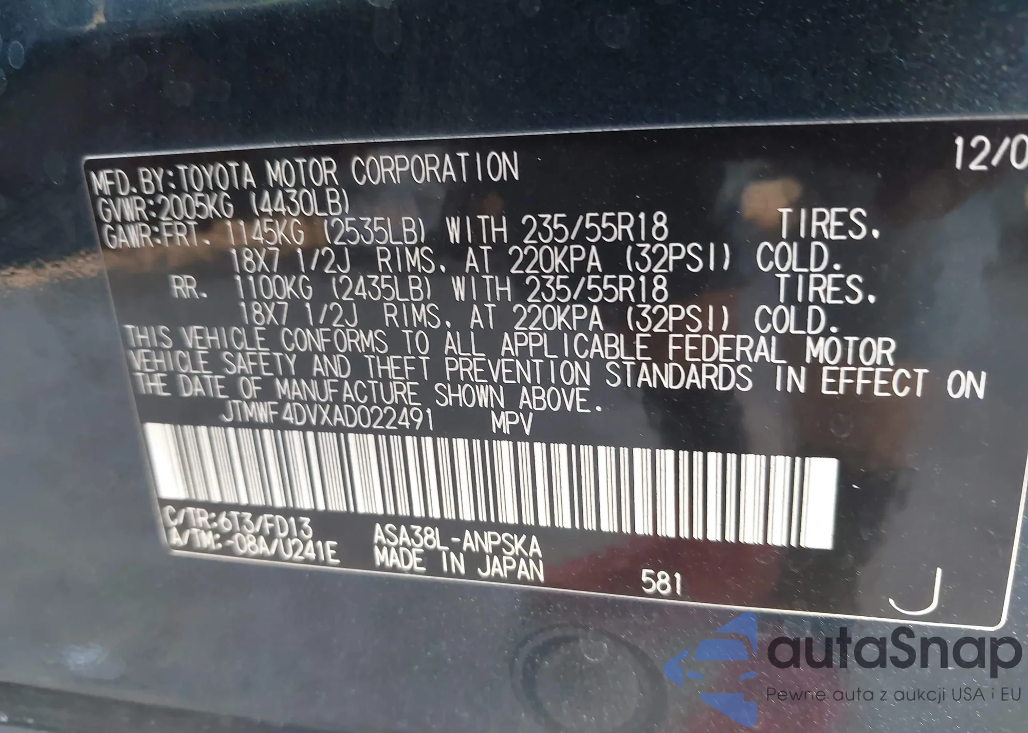 LOT: 44374342 VIN: JTMWF4DVXAD022491