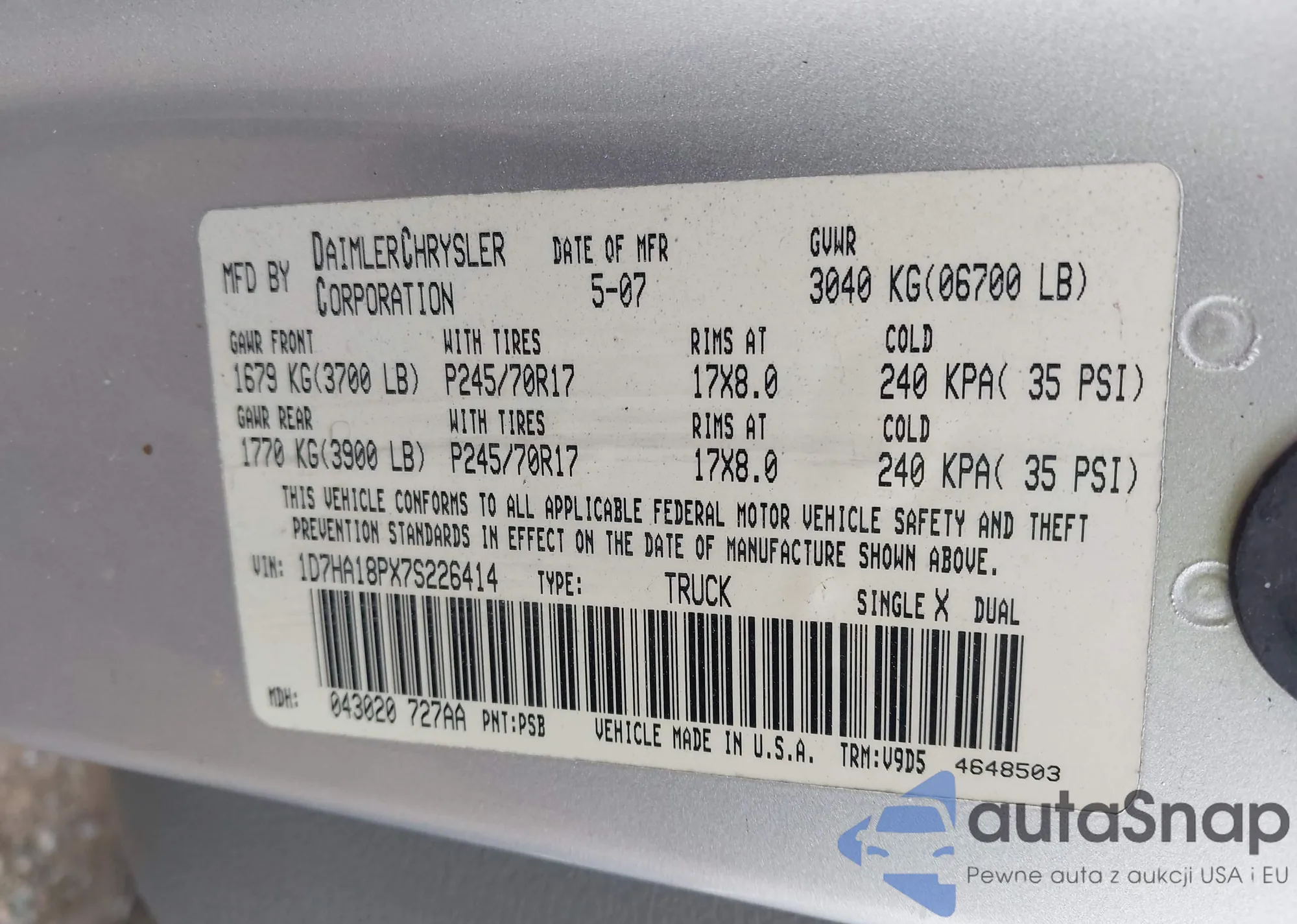 • VIN 1D7HA18PX7S226414