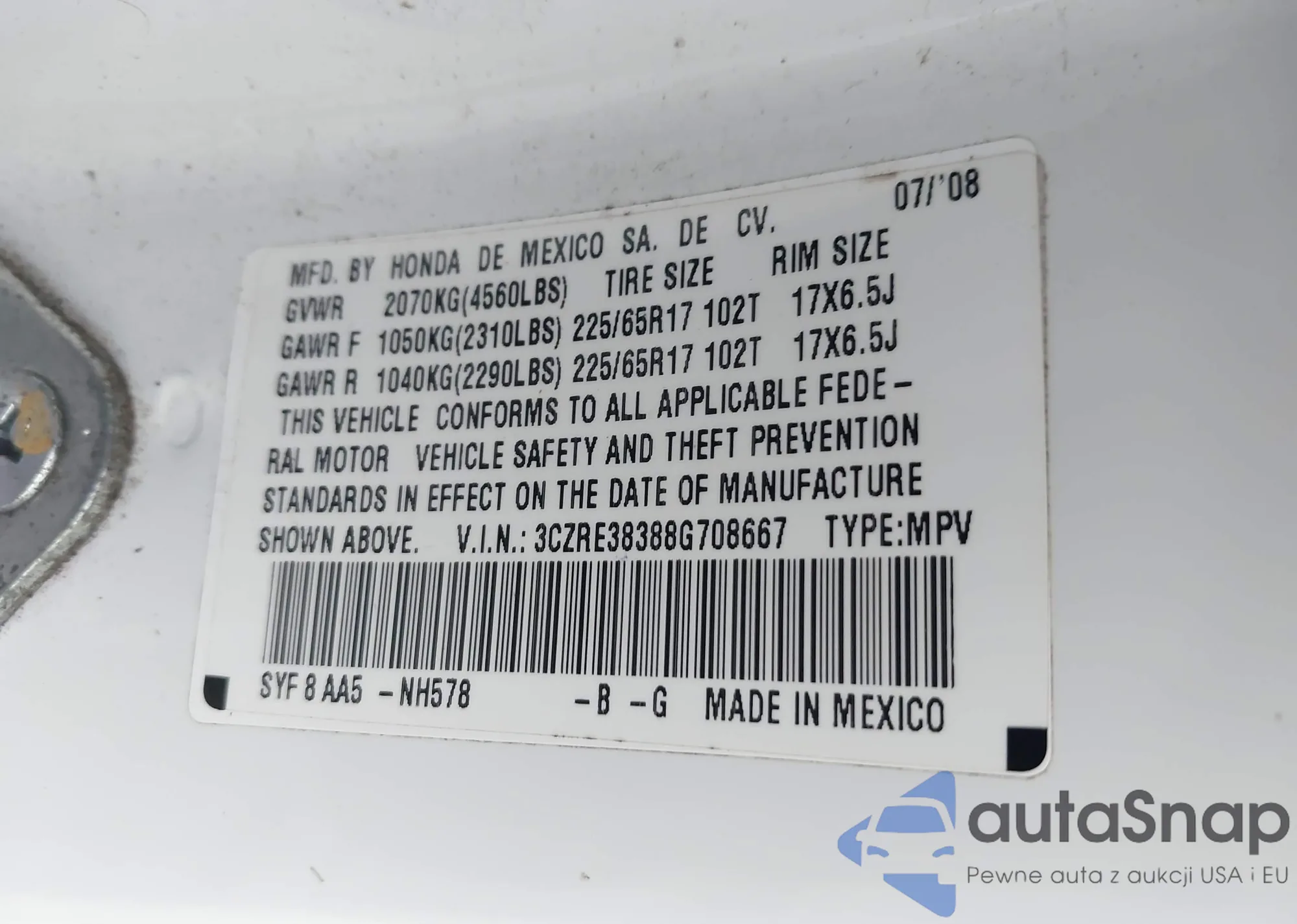 LOT: 43807873 VIN: 3CZRE38388G708667
