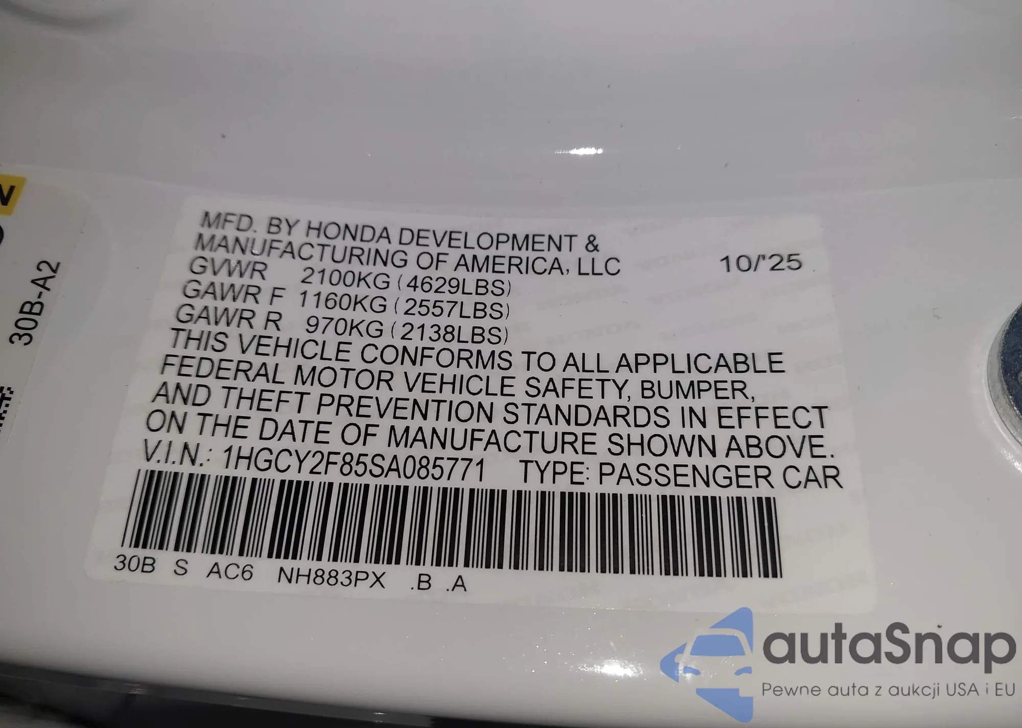 • VIN 1HGCY2F85SA085771