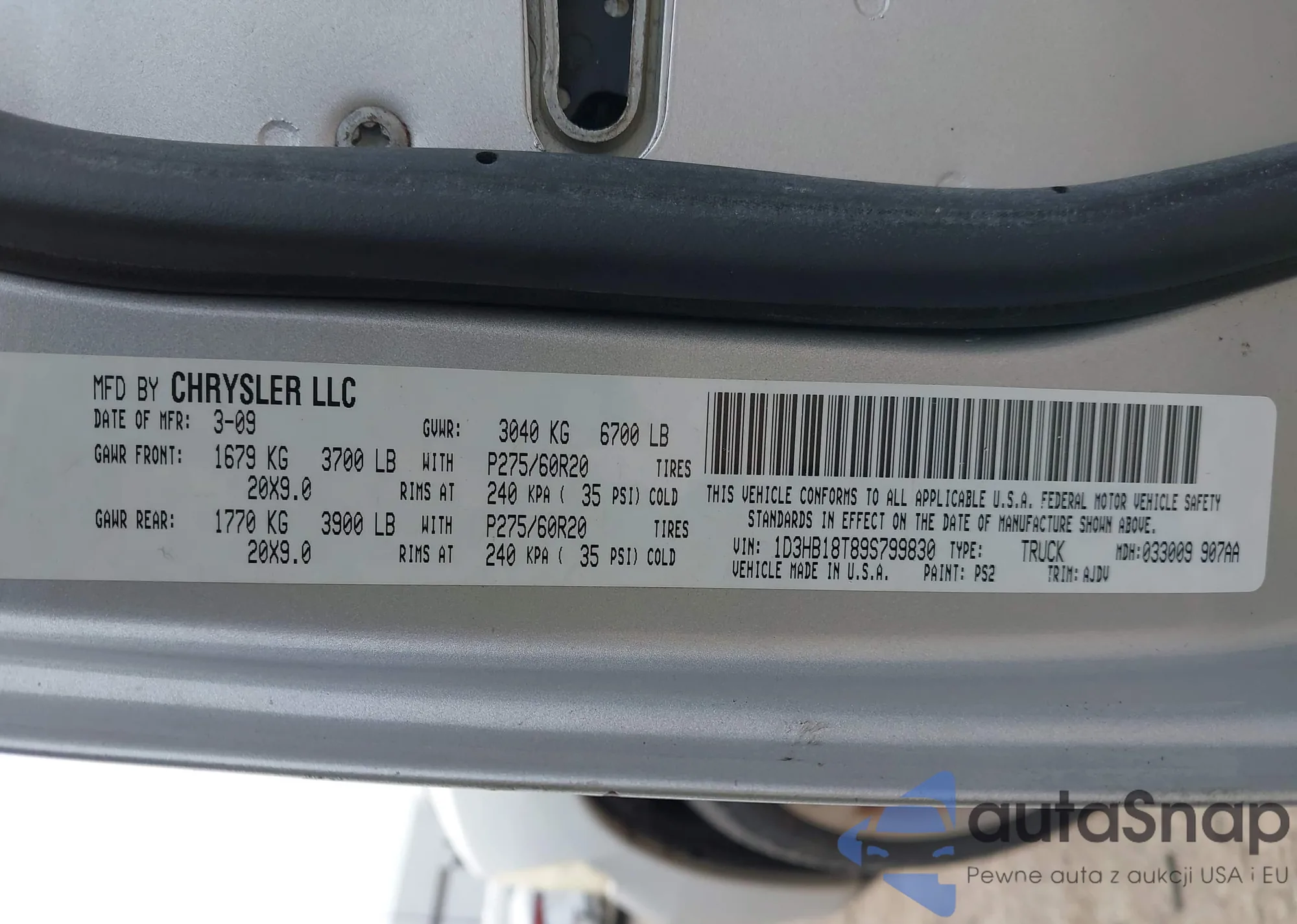 LOT: 43936300 VIN: 1D3HB18T89S799830