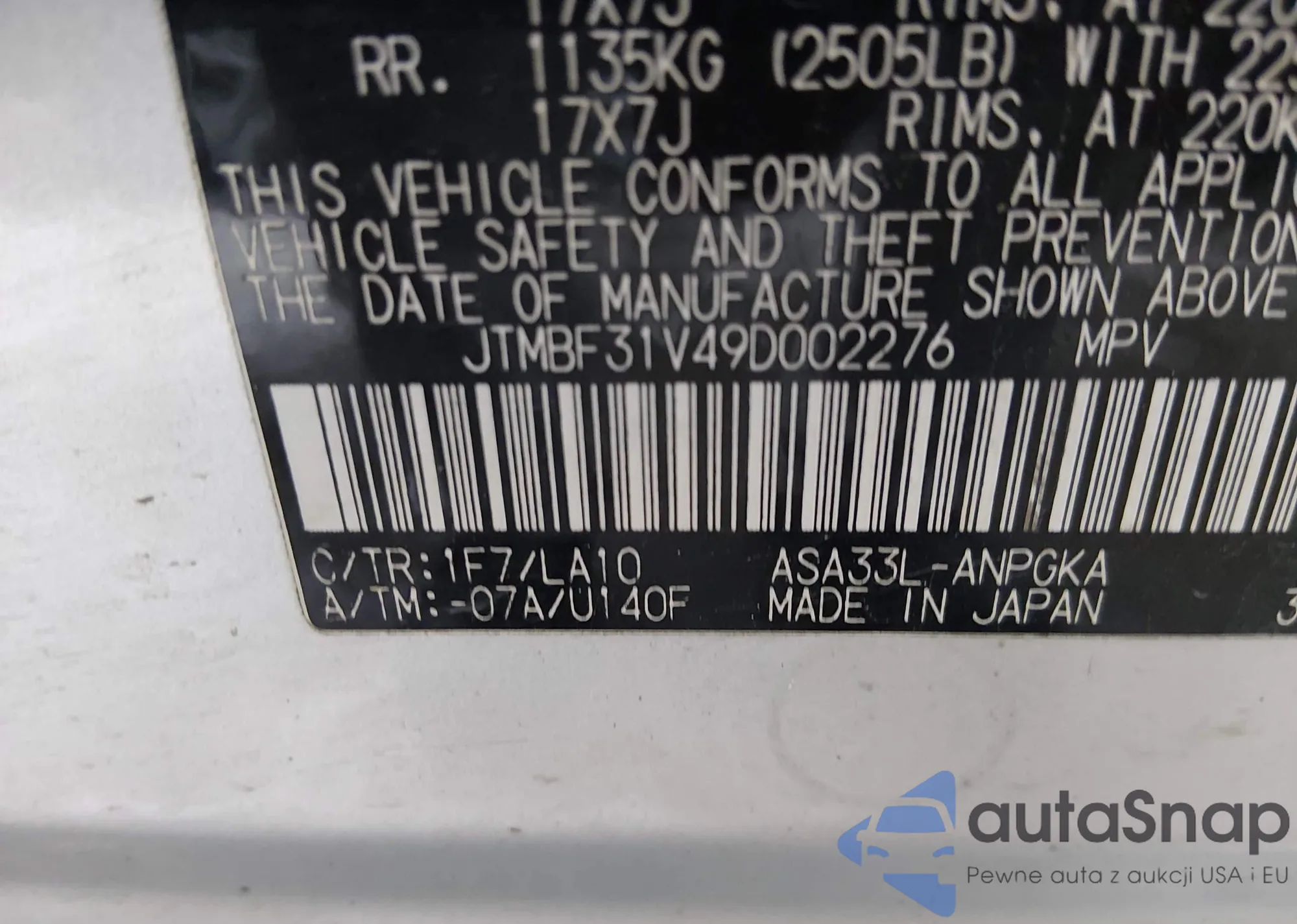 LOT: 44111870 VIN: JTMBF31V49D002276
