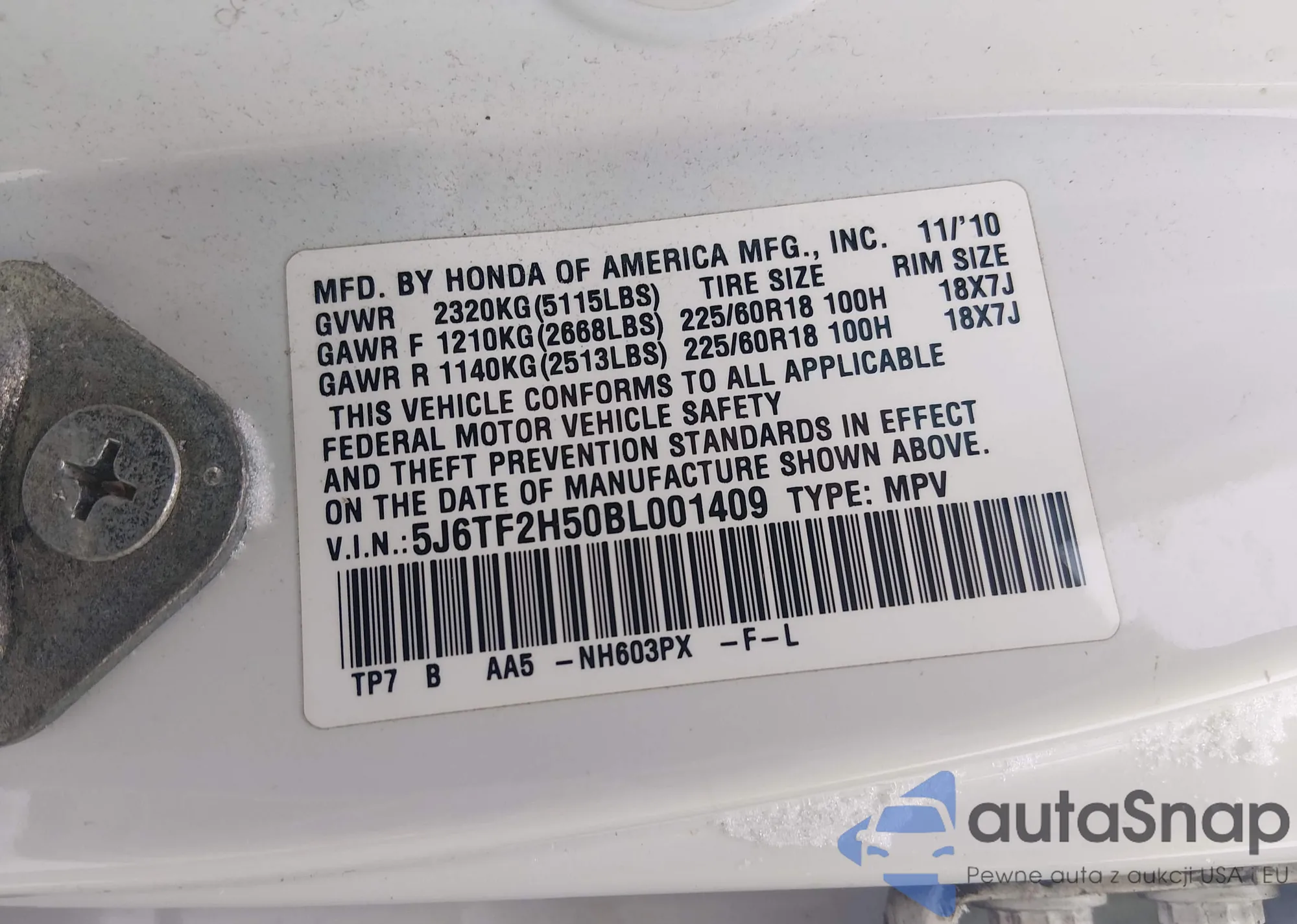 • VIN 5J6TF2H50BL001409