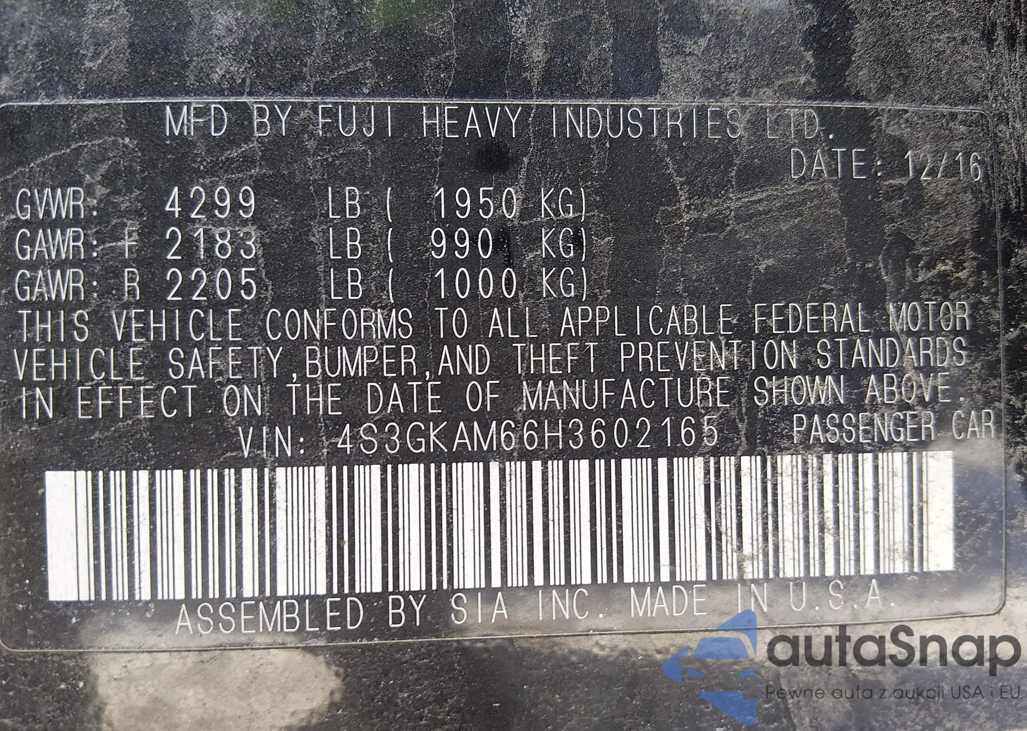 • VIN 4S3GKAM66H3602165