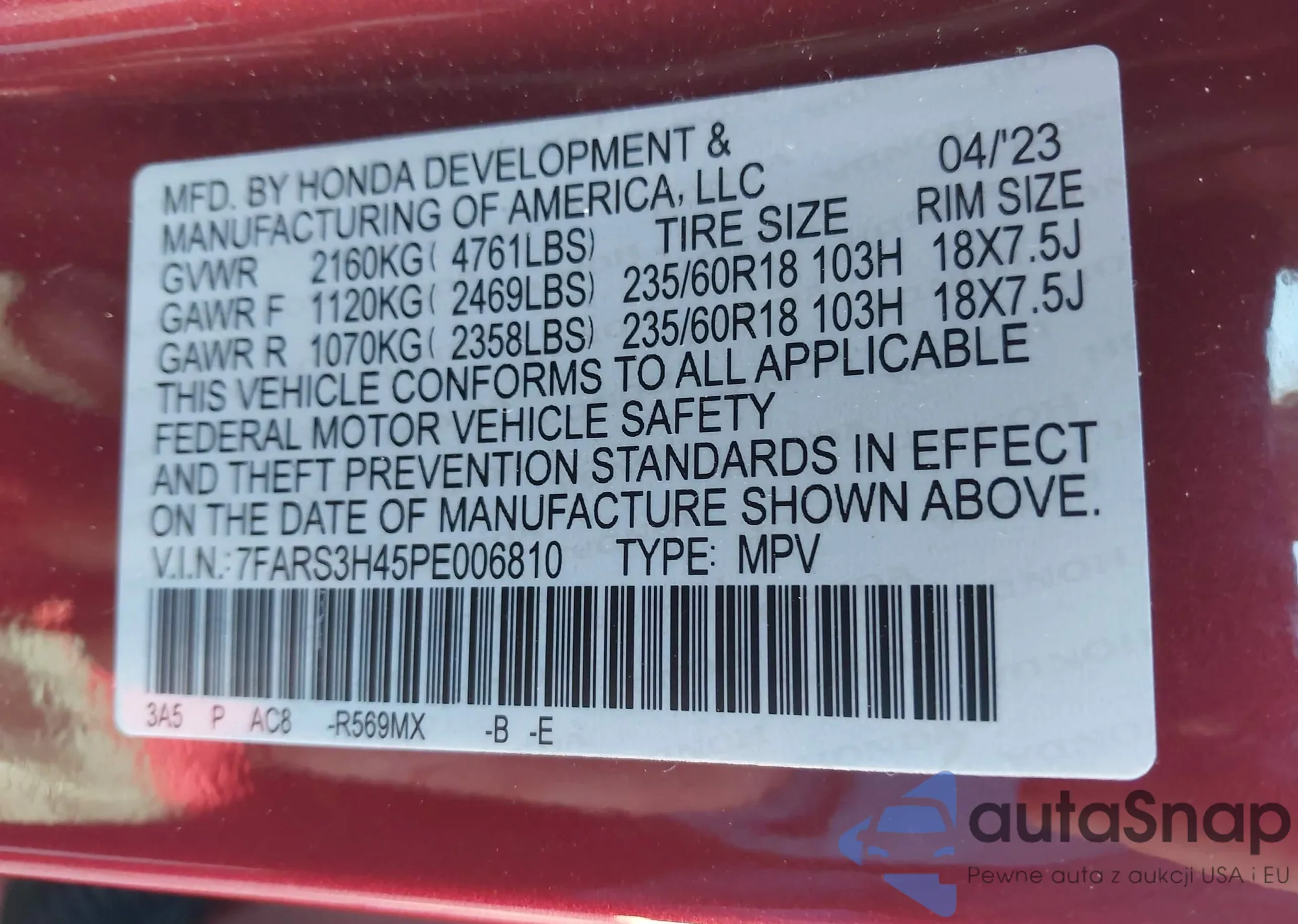 LOT: 43925436 VIN: 7FARS3H45PE006810