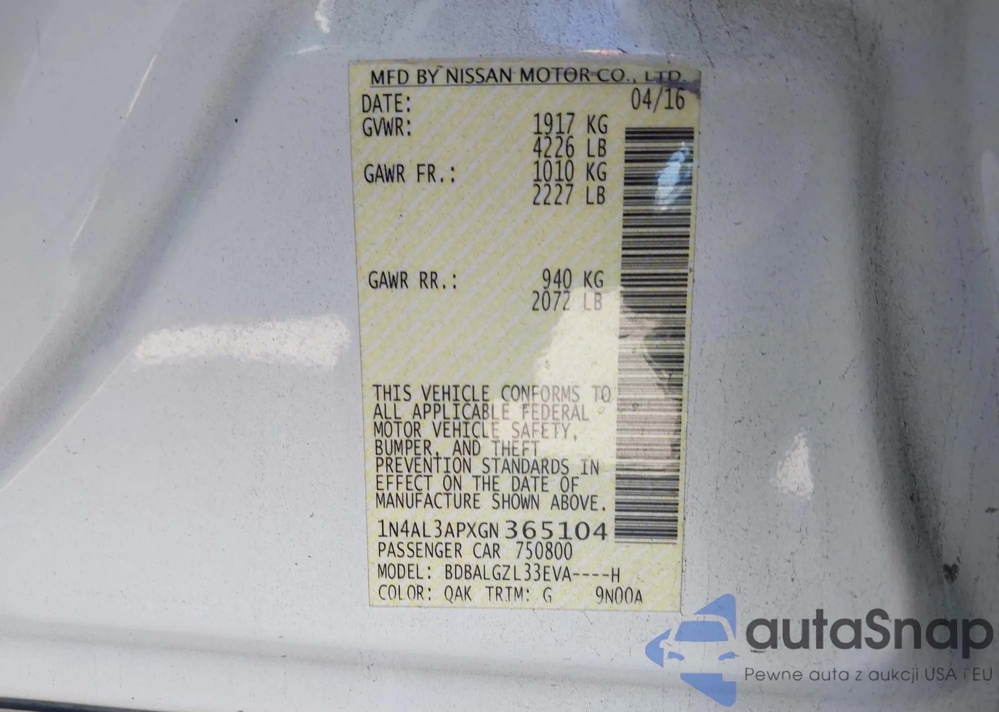 LOT: 44138220 VIN: 1N4AL3APXGN365104
