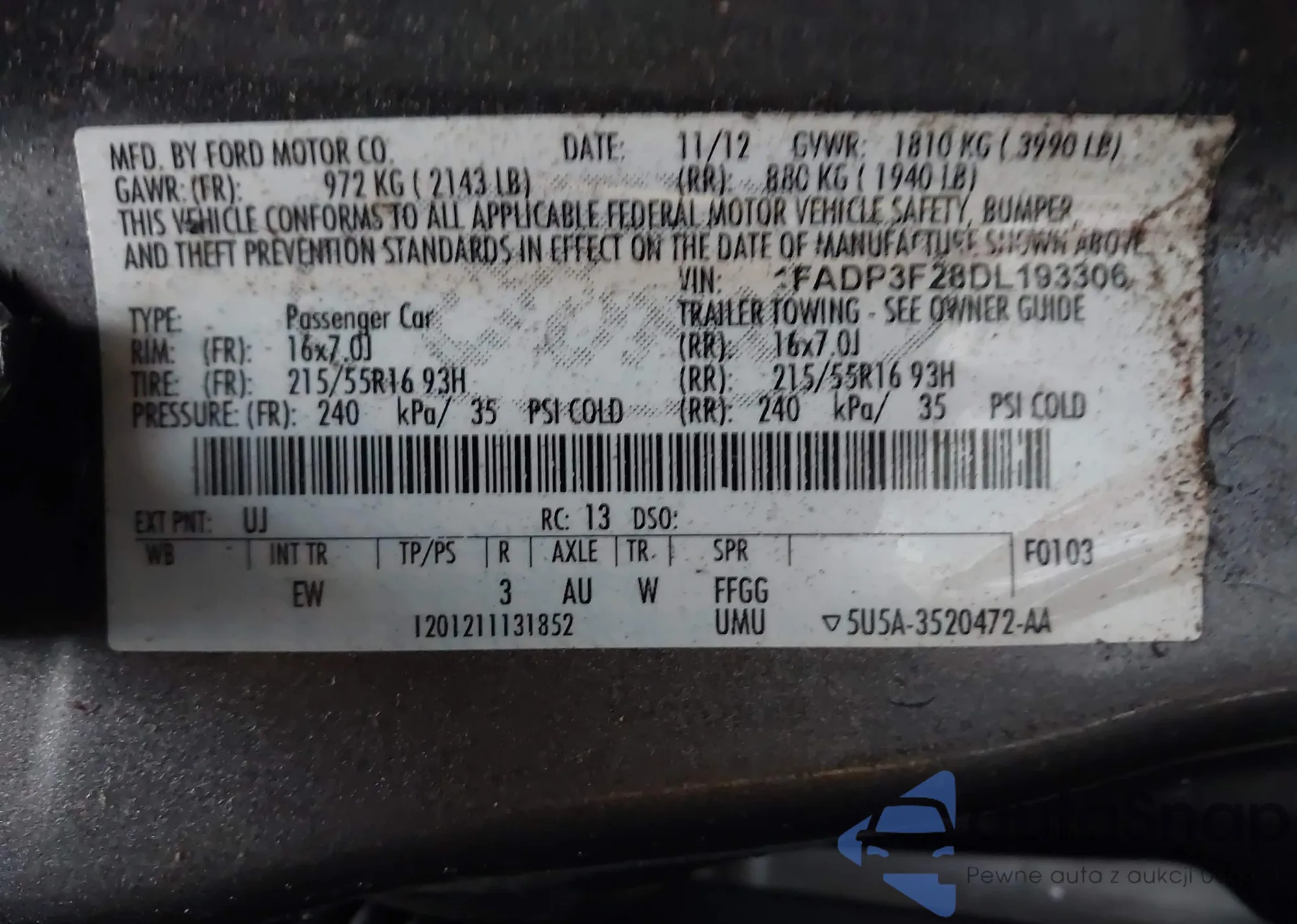 LOT: 44240935 VIN: 1FADP3F28DL193306
