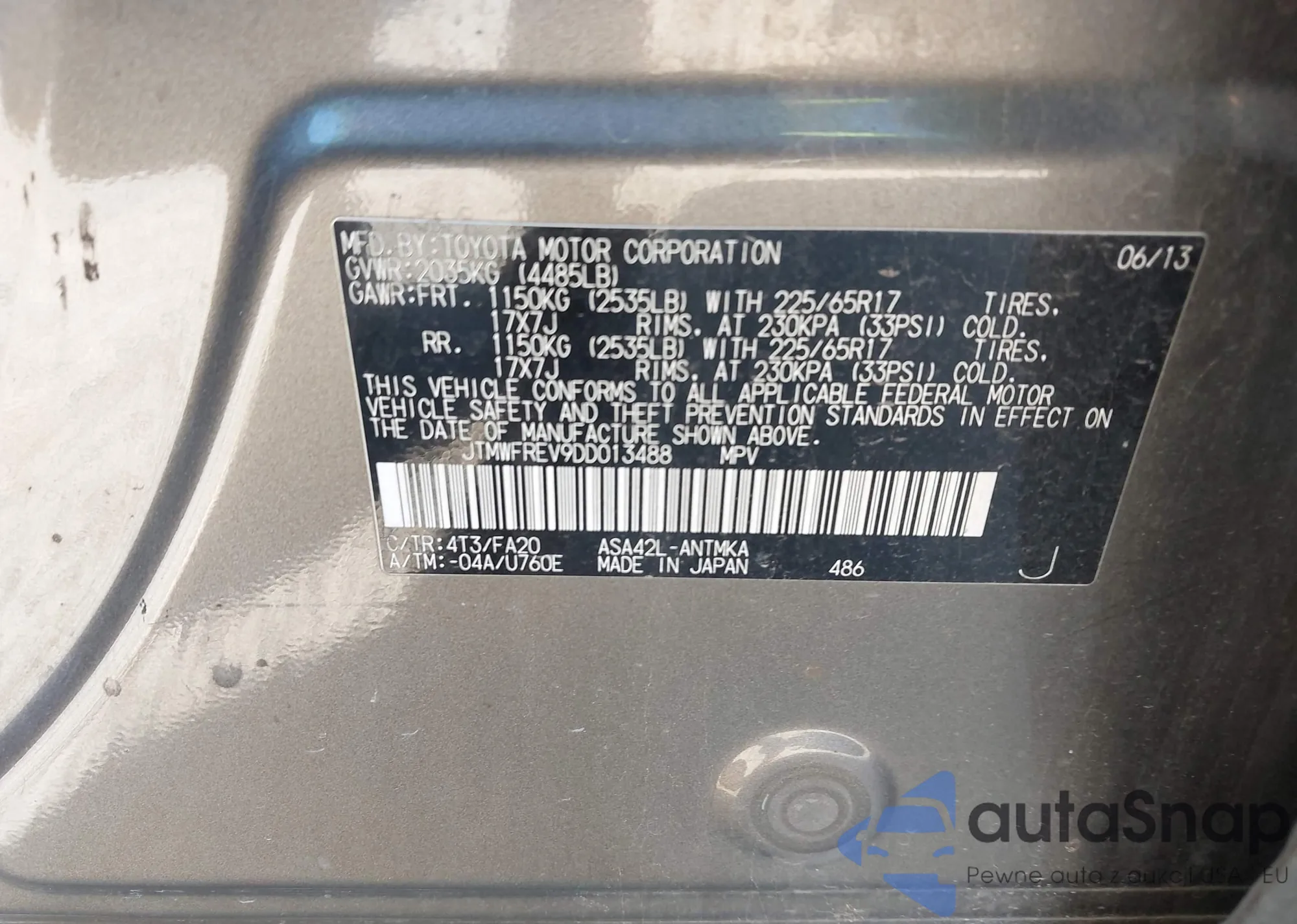 • VIN JTMWFREV9DD013488