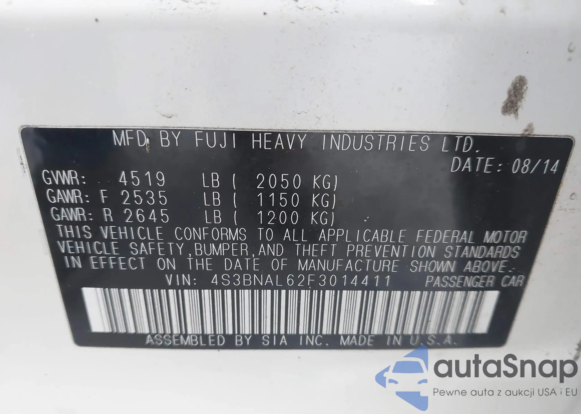 • VIN 4S3BNAL62F3014411