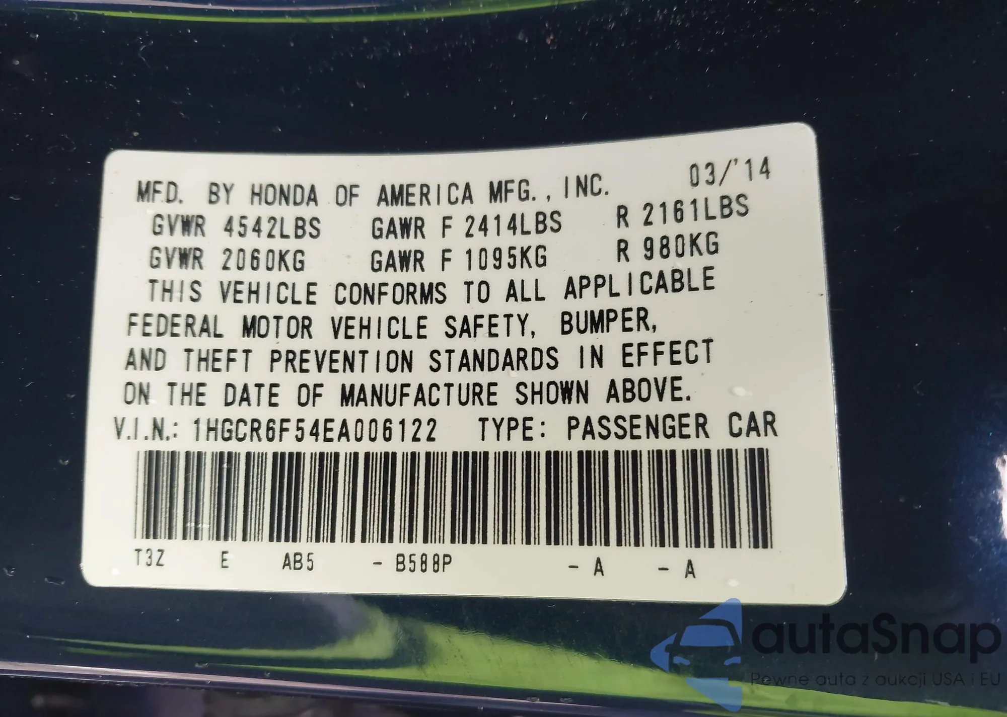 LOT: 44249405 VIN: 1HGCP26859A131256