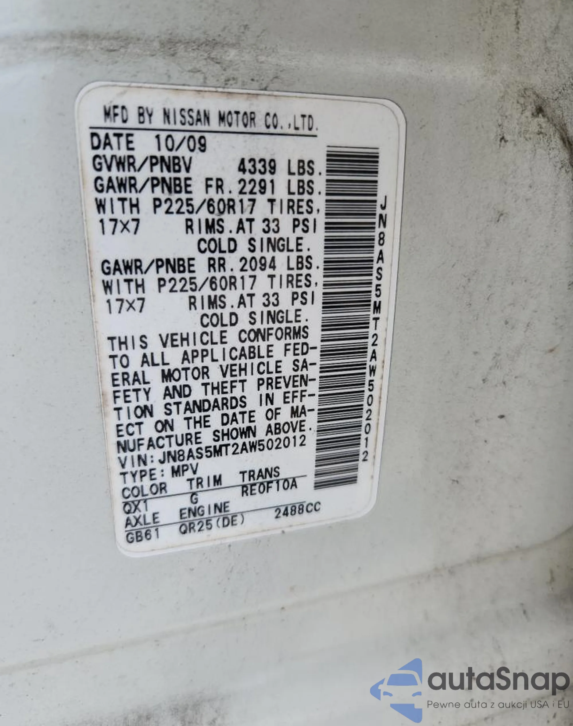 • VIN JN8AS5MT2AW502012