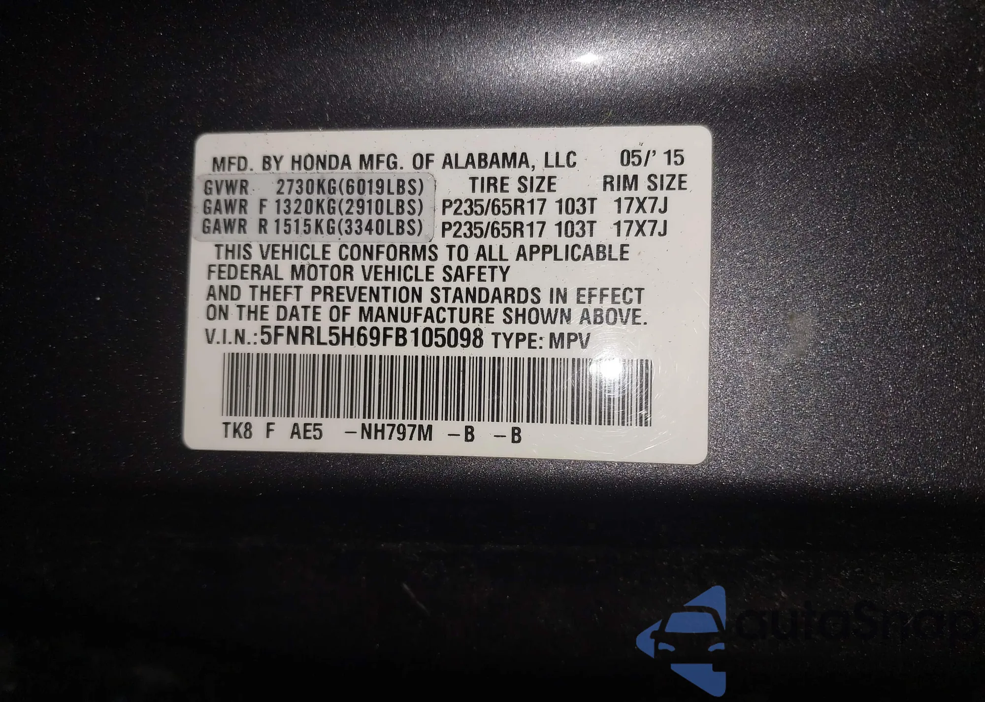 • VIN 5FNRL5H69FB105098