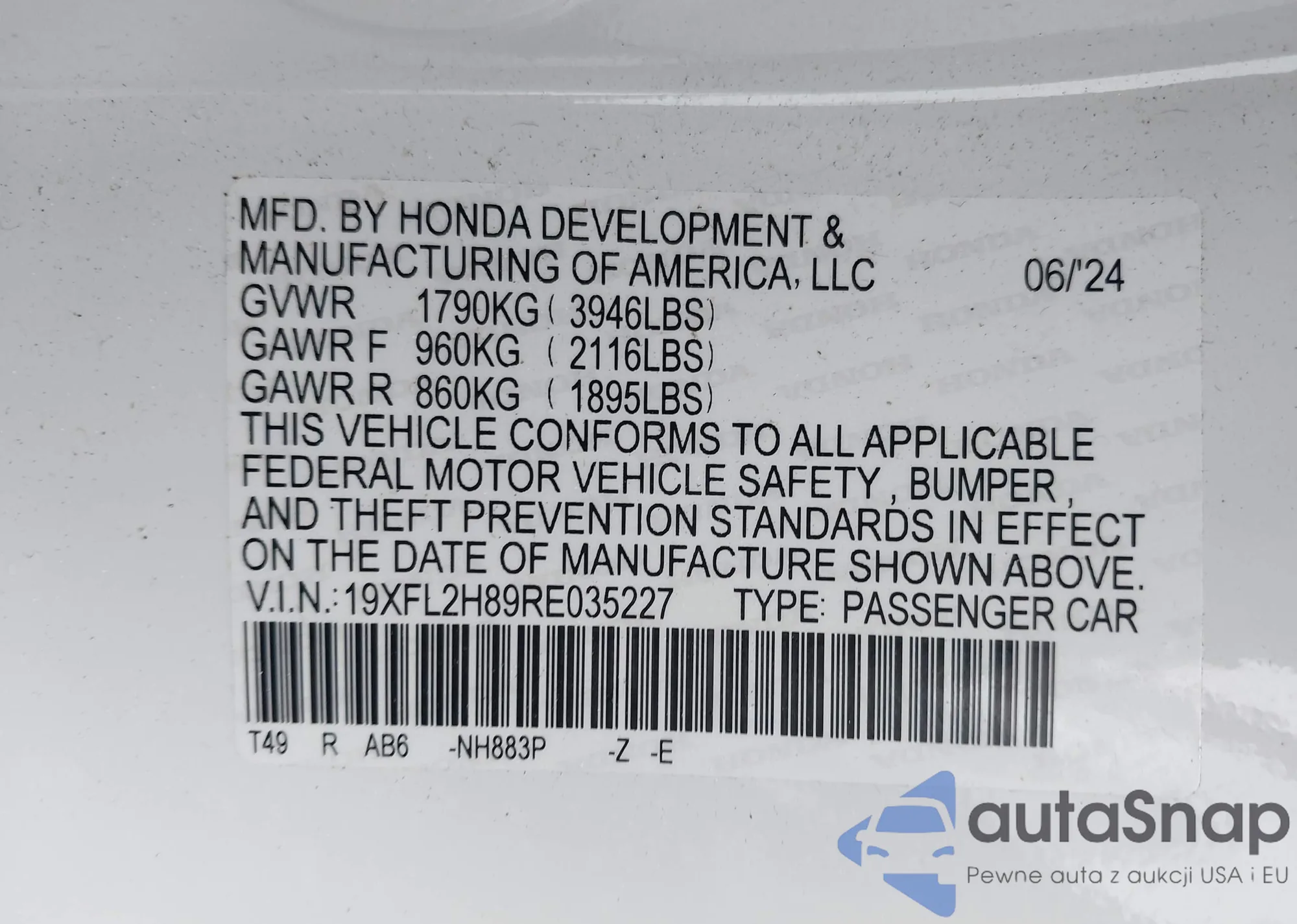 • VIN 19XFL2H89RE035227