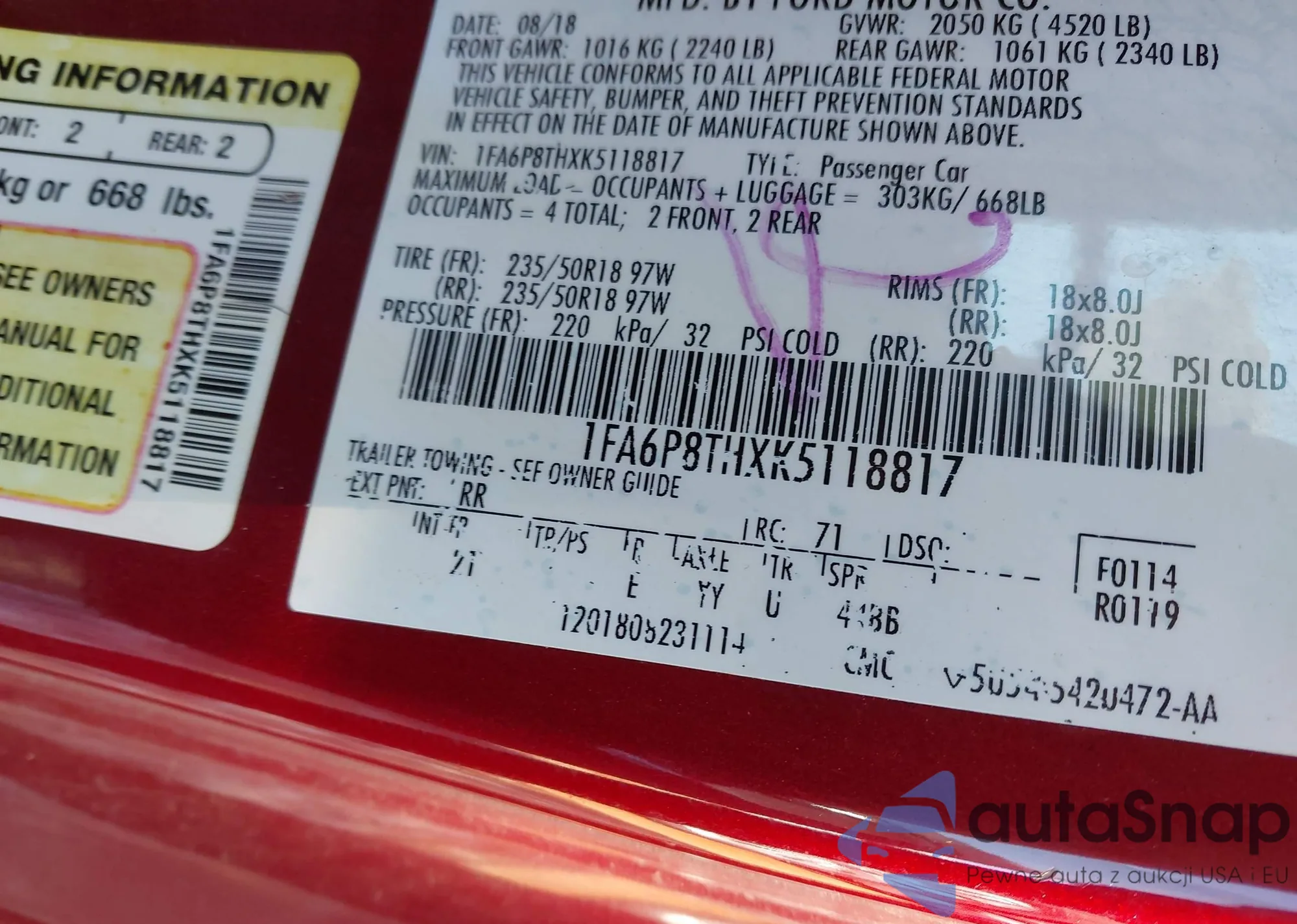 • VIN 1FA6P8THXK5118817