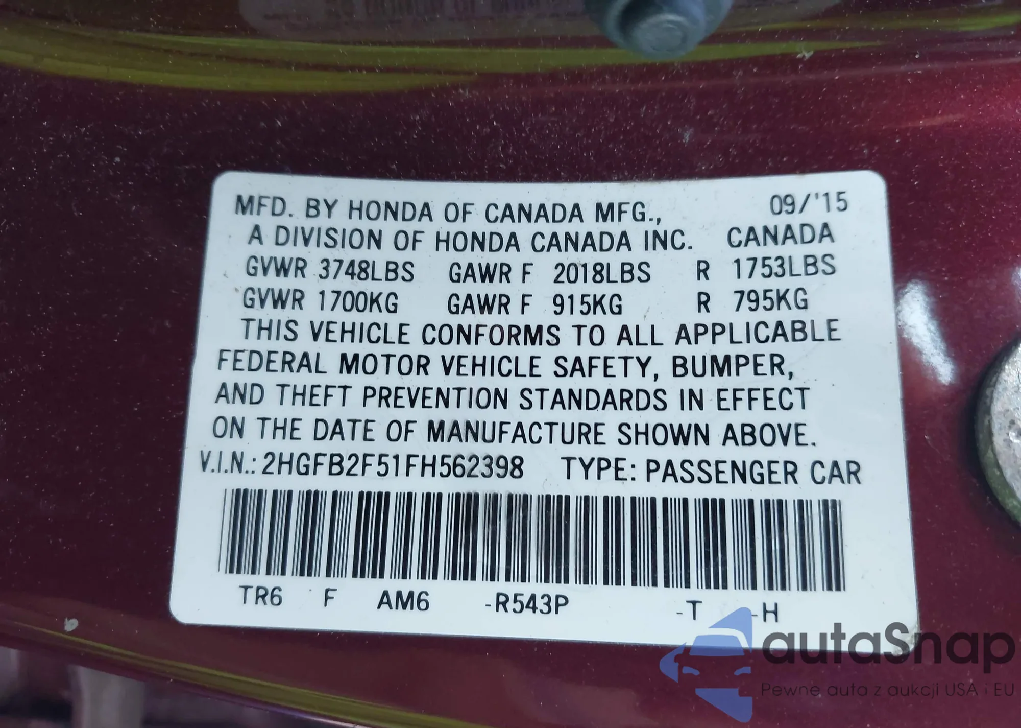 • VIN 2HGFB2F51FH562398