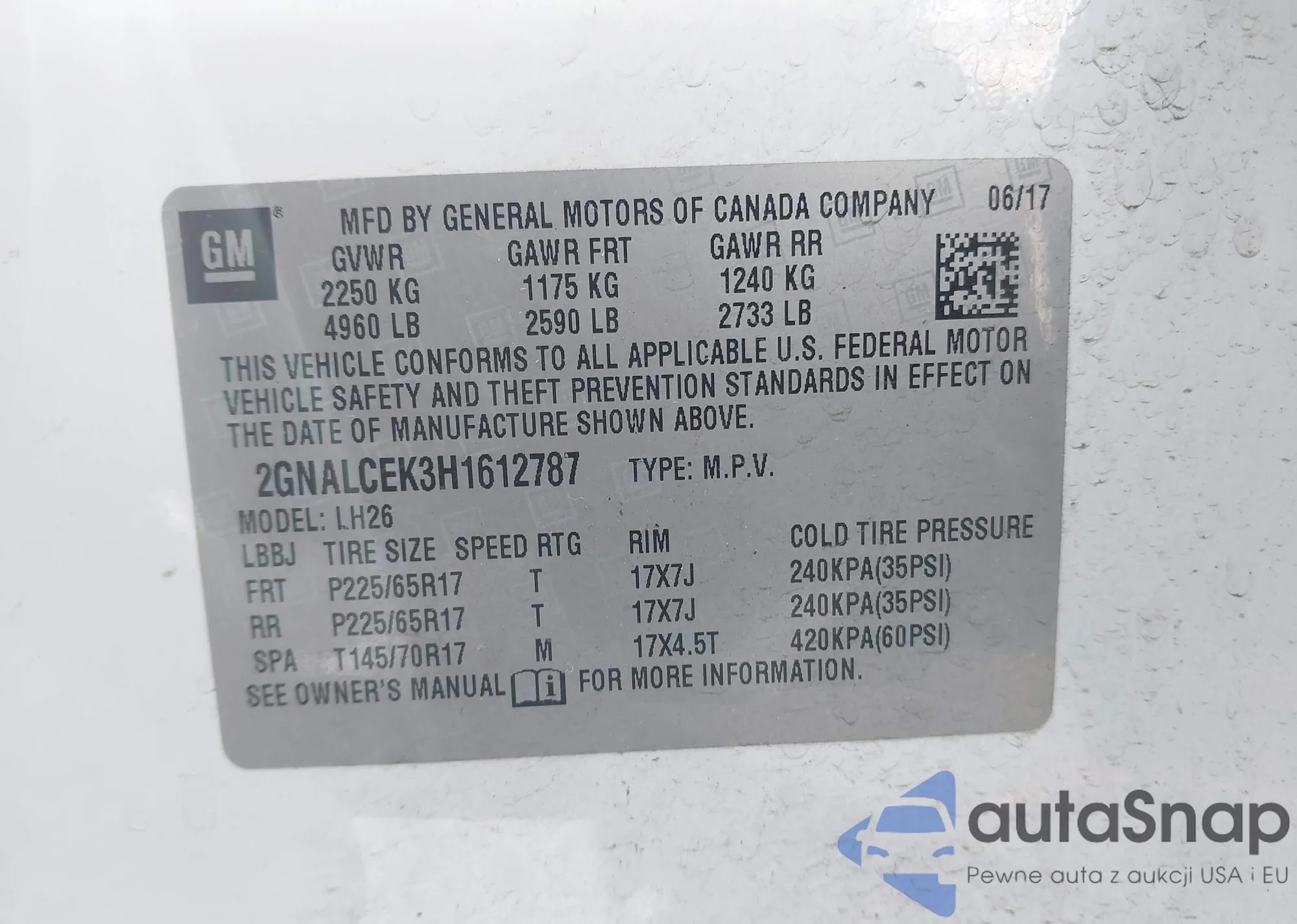 LOT: 43105556 VIN: 2GNALCEK3H1612787