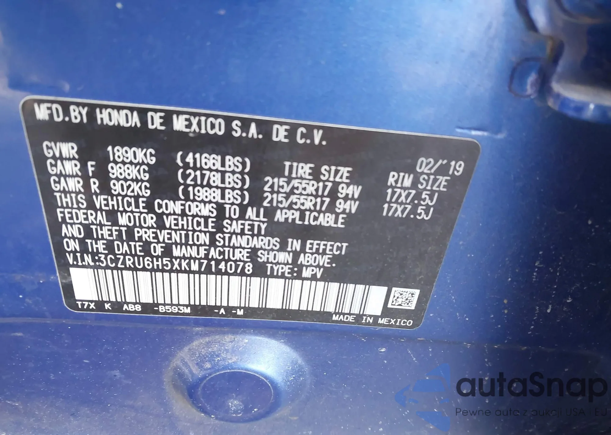 • VIN 3CZRU6H5XKM714078