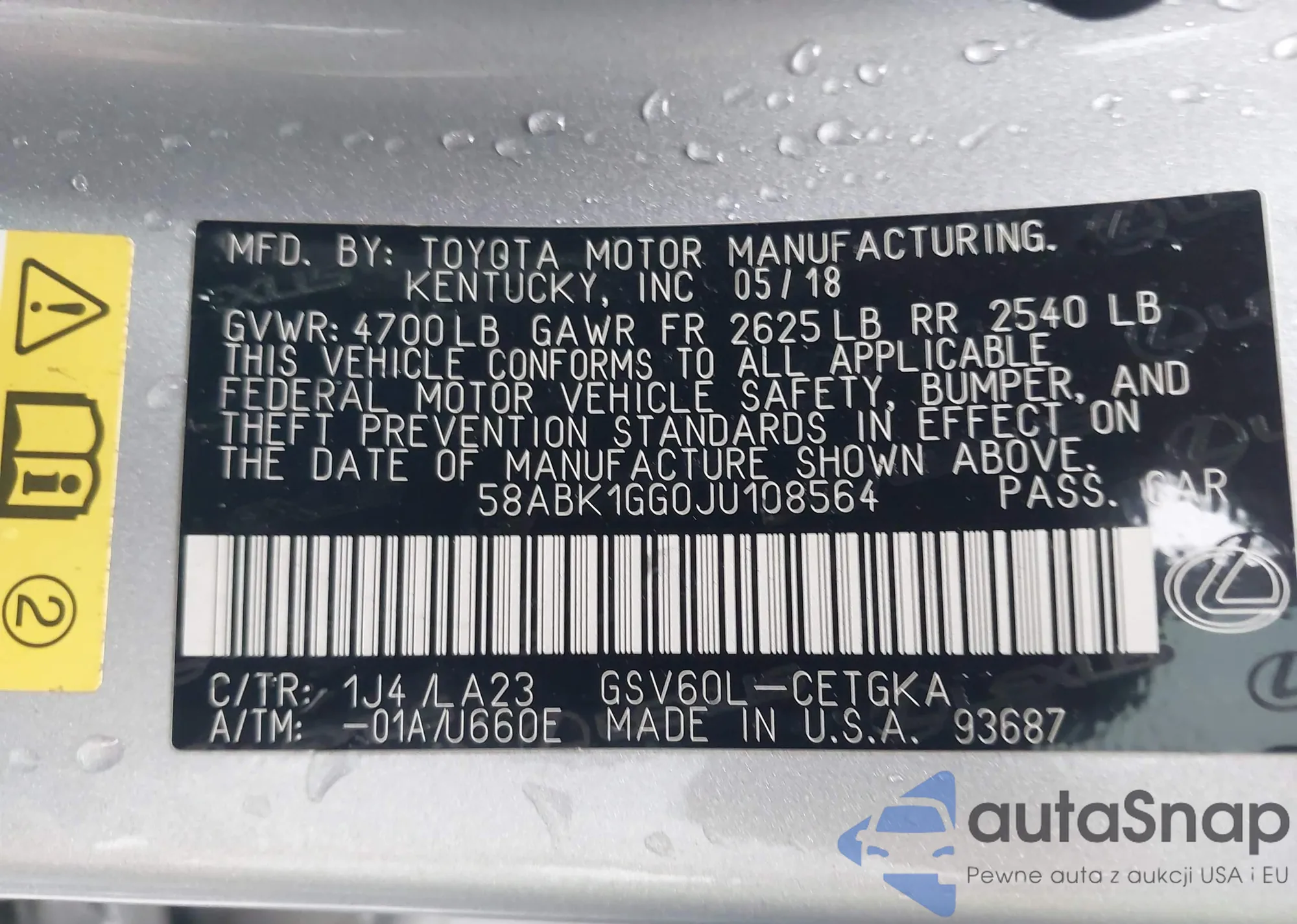 • VIN 58ABK1GG0JU108564