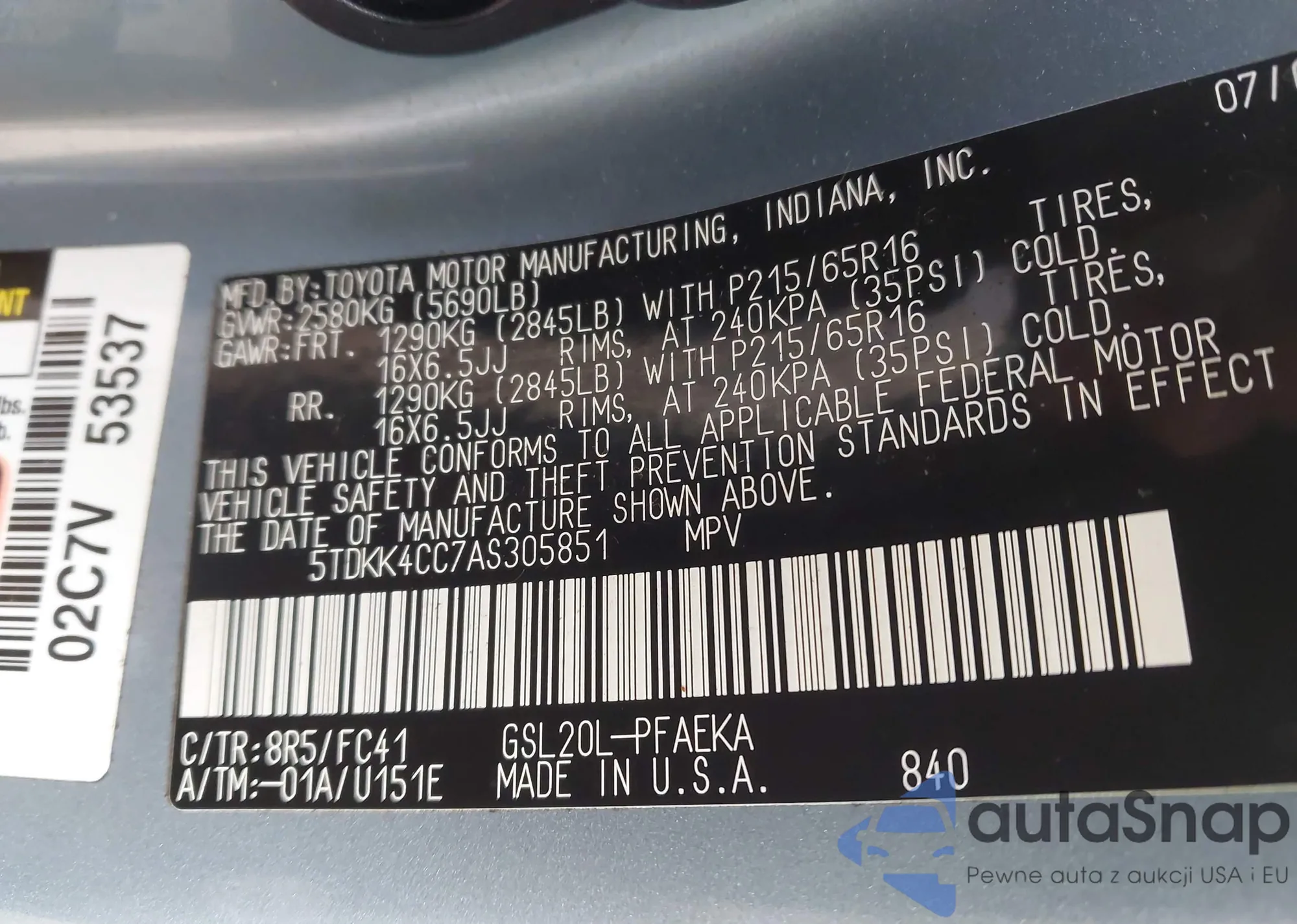LOT: 43869054 VIN: 5TDKK4CC7AS305851