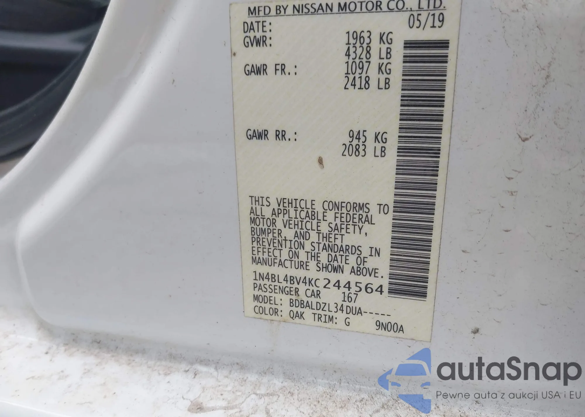 LOT: 44075245 VIN: 1N4BL4BV4KC244564