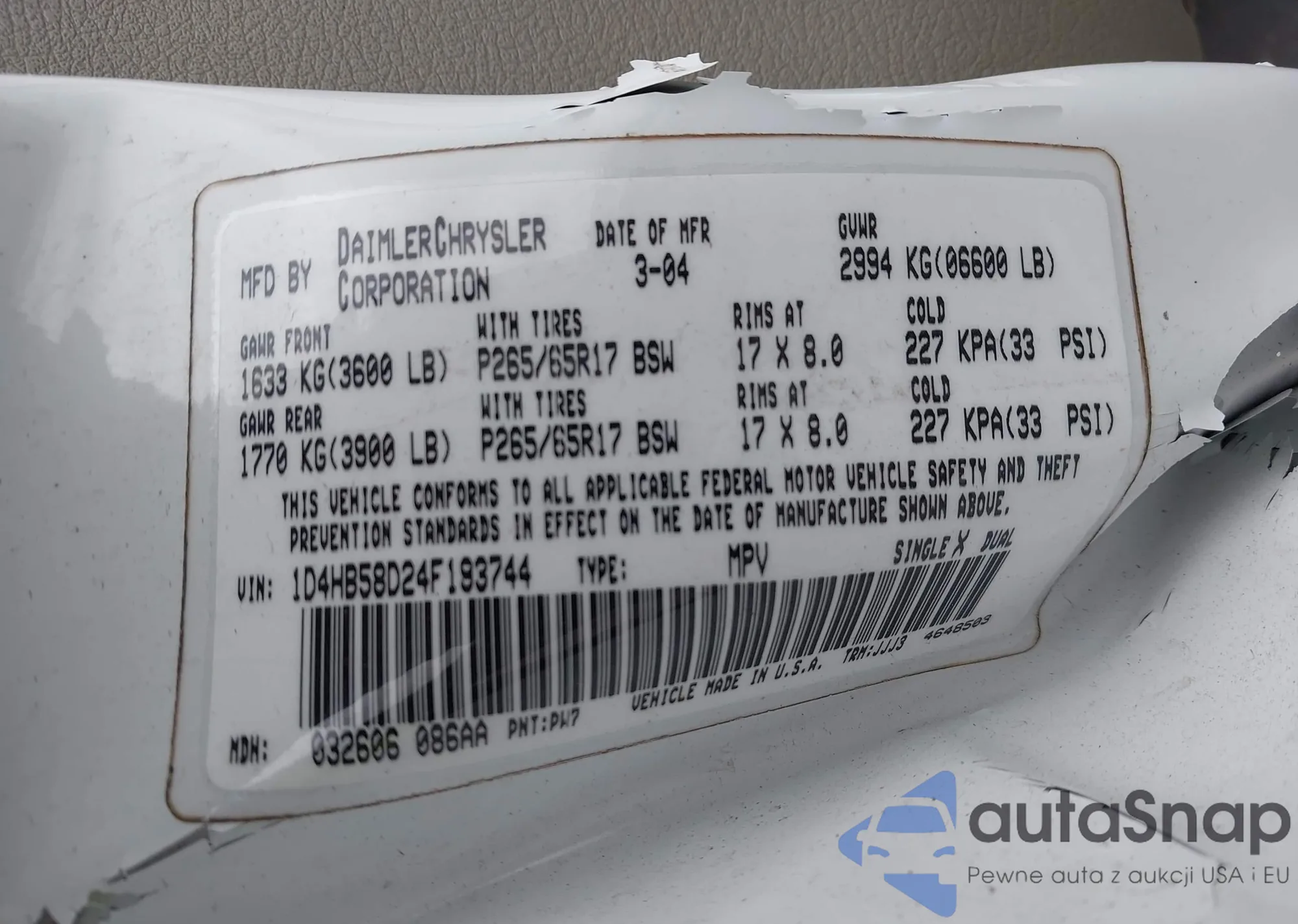 LOT: 44327995 VIN: 1D4HB58D24F193744
