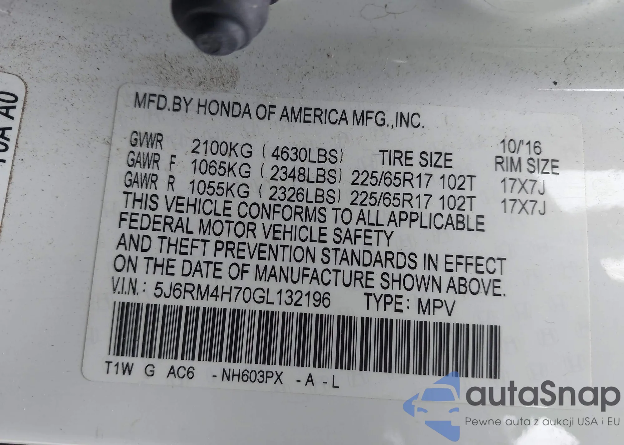 • VIN 5J6RM4H70GL132196