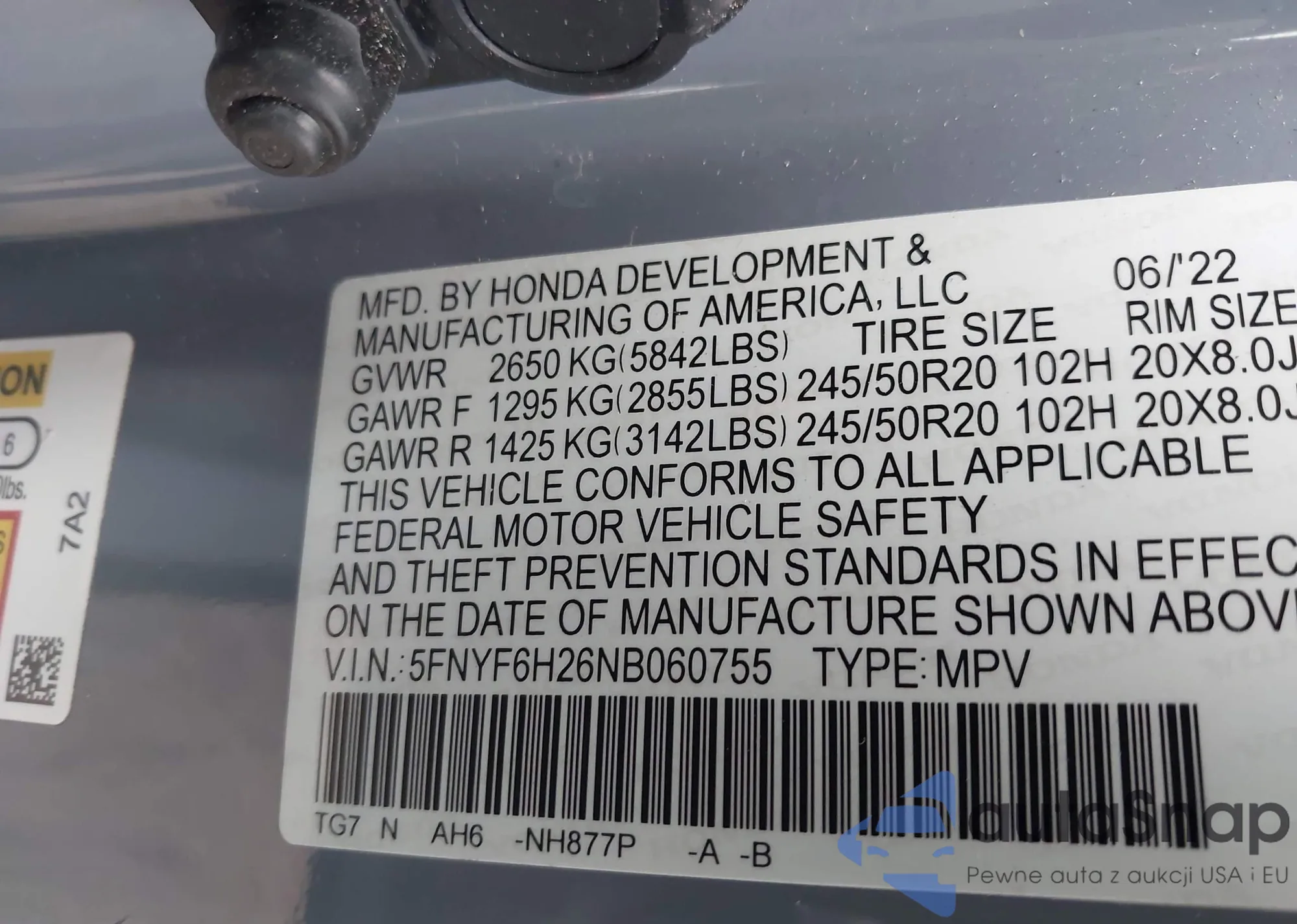 • VIN 5FNYF6H26NB060755