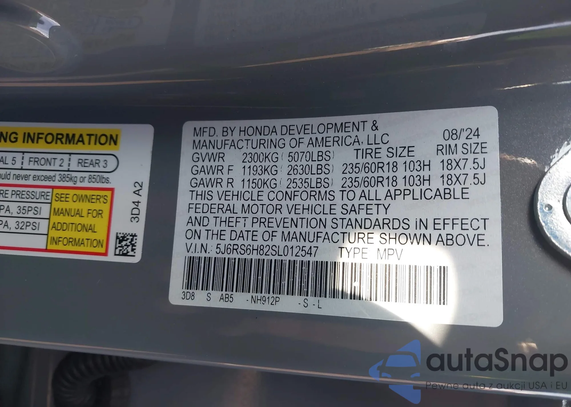 • VIN 5J6RS6H82SL012547