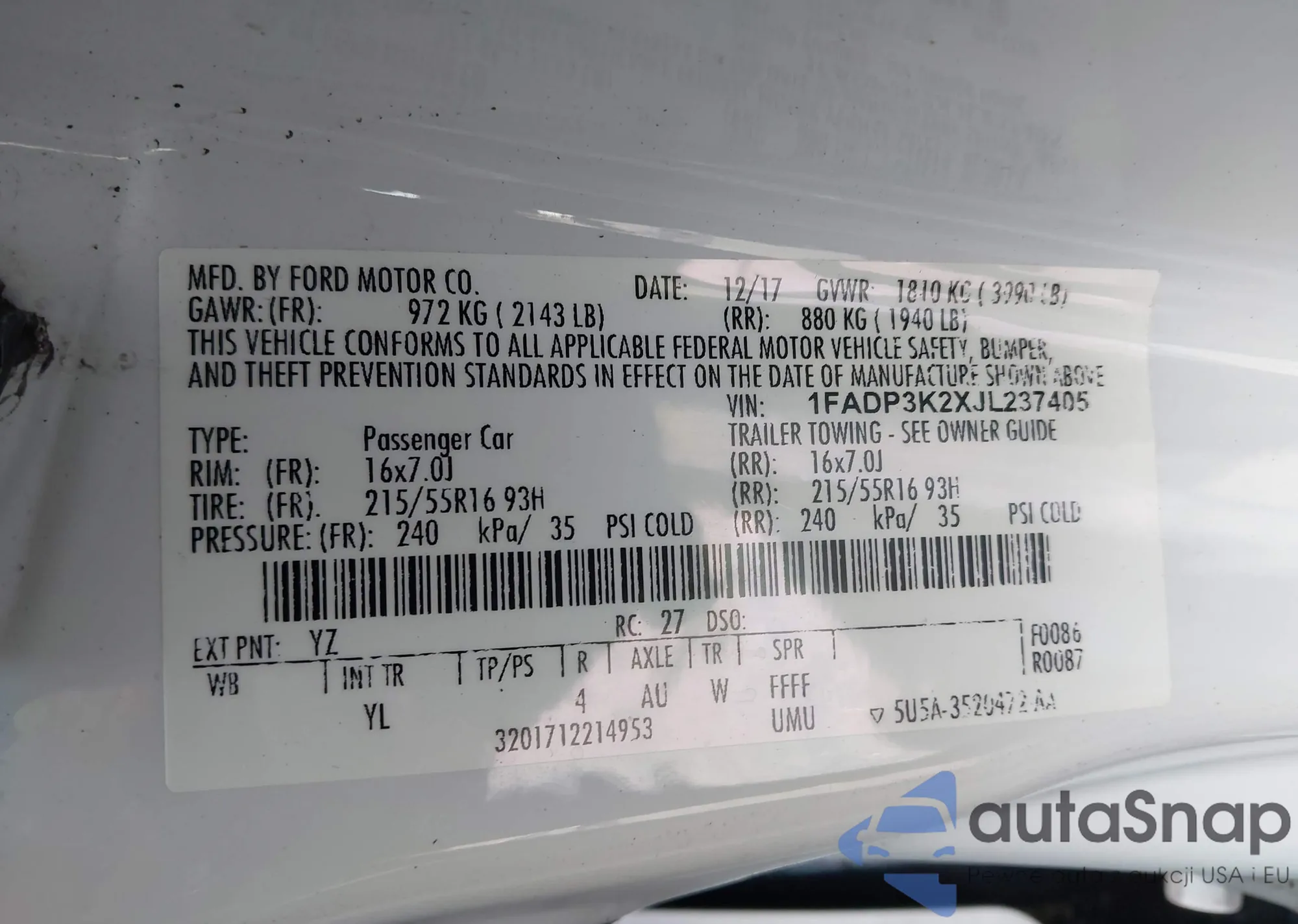 • VIN 1FADP3K2XJL237405