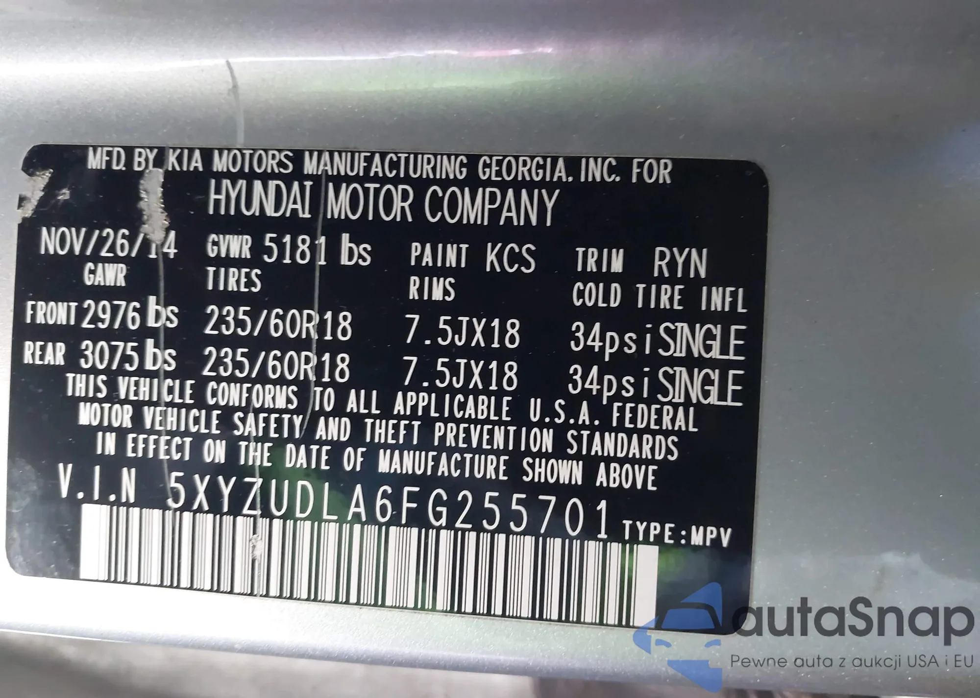 • VIN 5XYZUDLA6FG255701